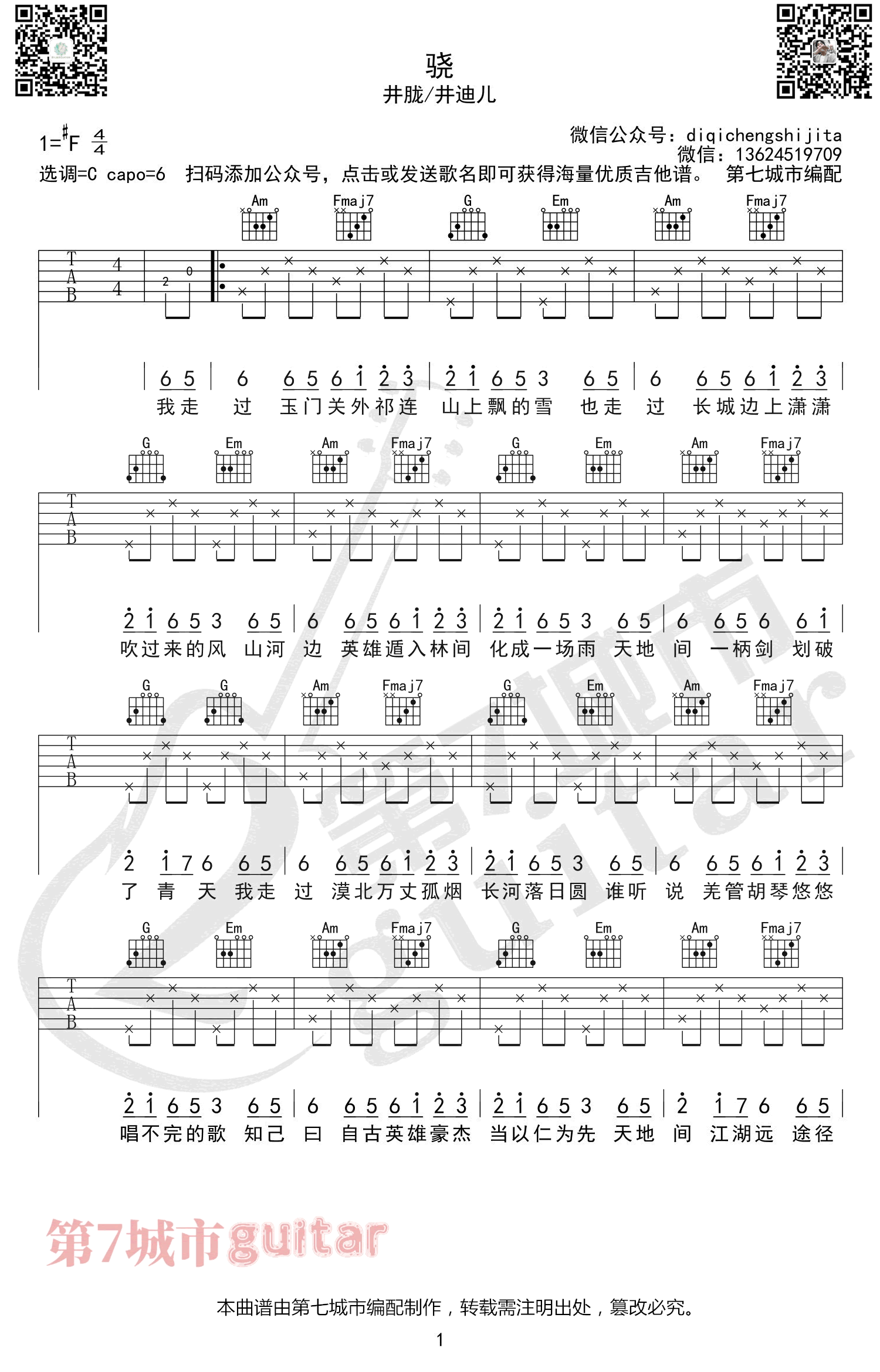 曲谱介绍: 井胧/井迪儿合唱的一首古风歌曲,骁吉他谱,原调#F,选调C,CAPO夹六品。骁吉他六线谱,两张弹唱图片谱。