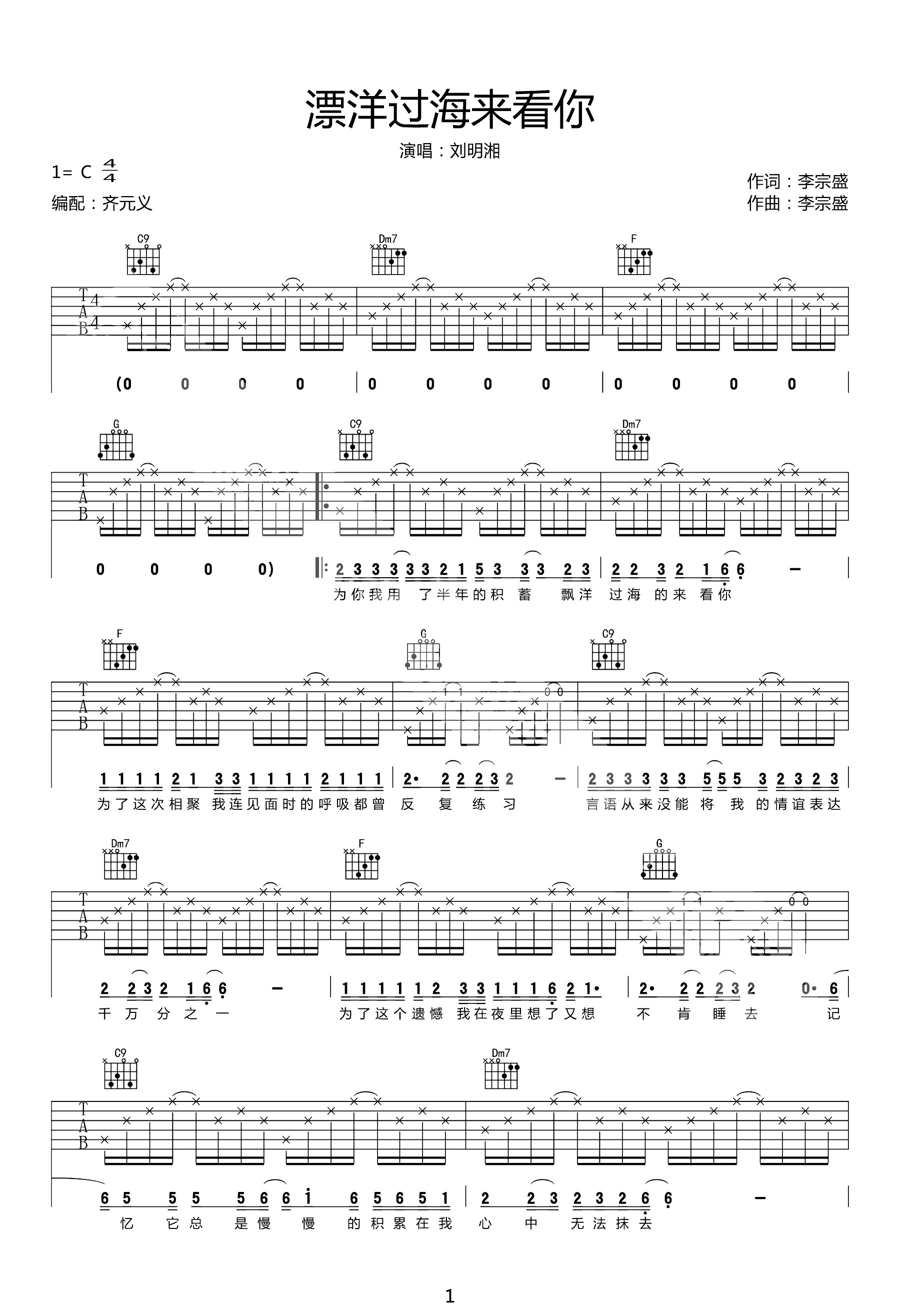 漂洋过海来看你吉他谱 - 刘明湘/李宗盛 - C调吉他弹唱谱