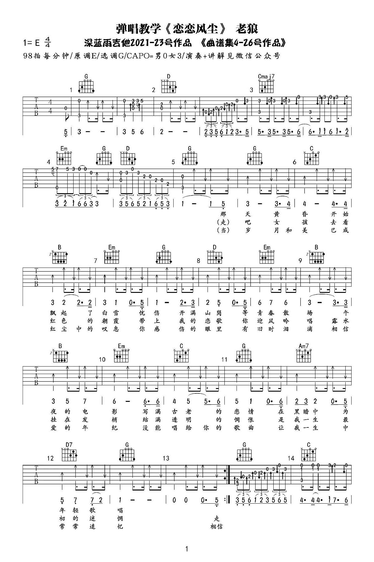 曲谱介绍: 恋恋风尘吉他谱,老狼的一首代表歌曲,高晓松的经典校园民谣。恋恋风尘六线谱,原调E选调G,CAPO男0女3,两张弹唱图片谱。随谱附上吉他弹唱视频,同学们跟随老师的演示练习。电视机里在放程璧的全新演绎《恋恋风尘》,浅浅的呢喃声让人沉醉。