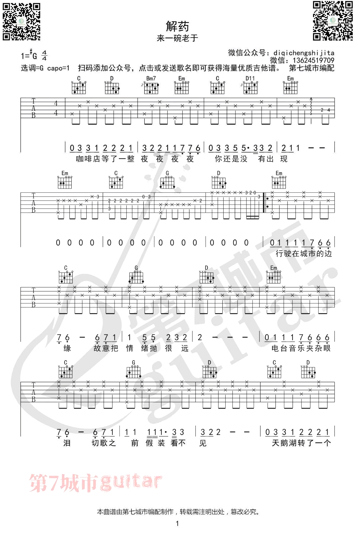 解药吉他谱 - 来一碗老于 - G调吉他弹唱谱