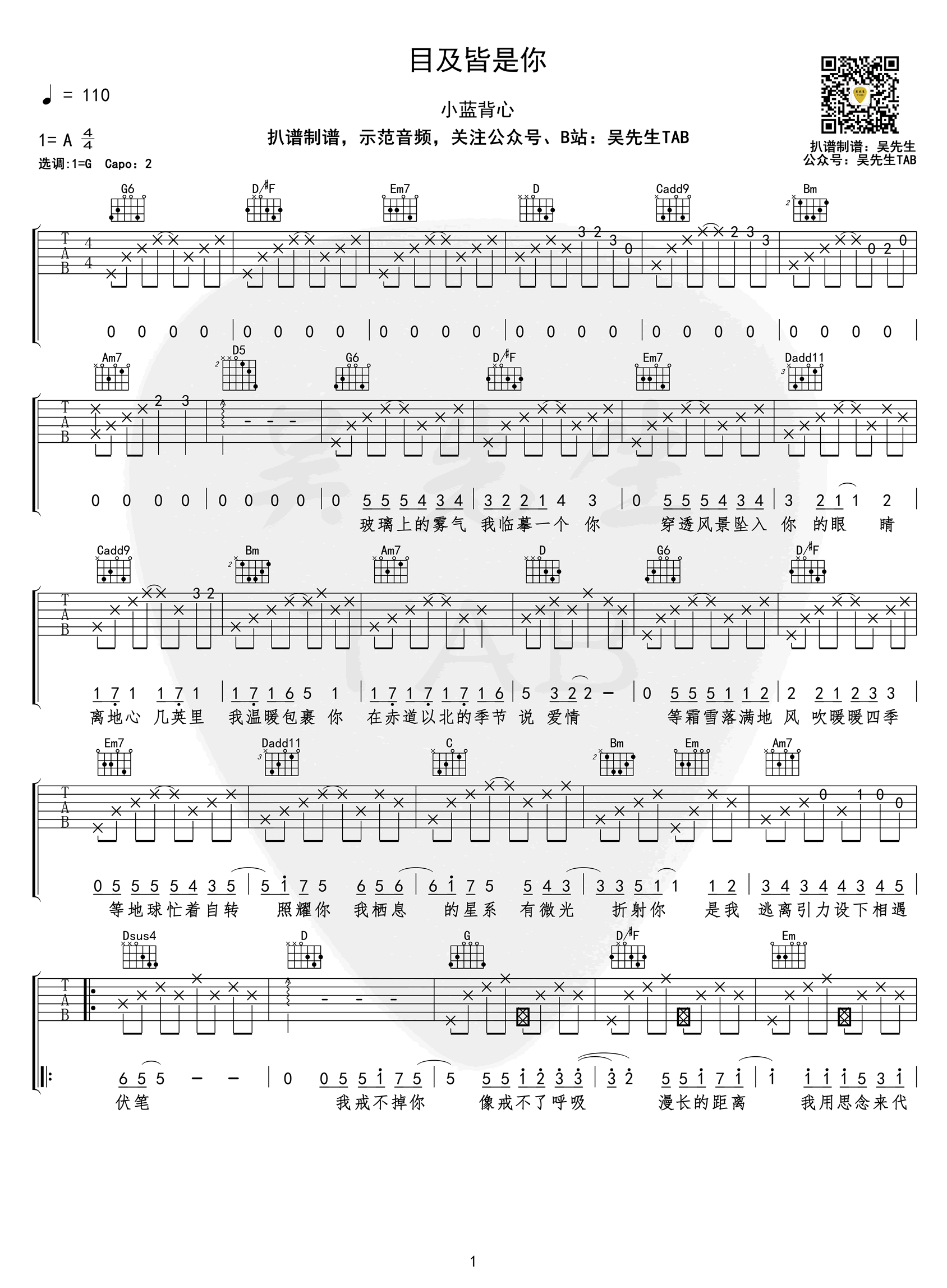 曲谱介绍: 目及皆是你吉他谱,小蓝背心演唱的一首网络热门歌曲。目及皆是你六线谱,原调A,选用G调指法,变调夹夹第二品,三张高清图片。