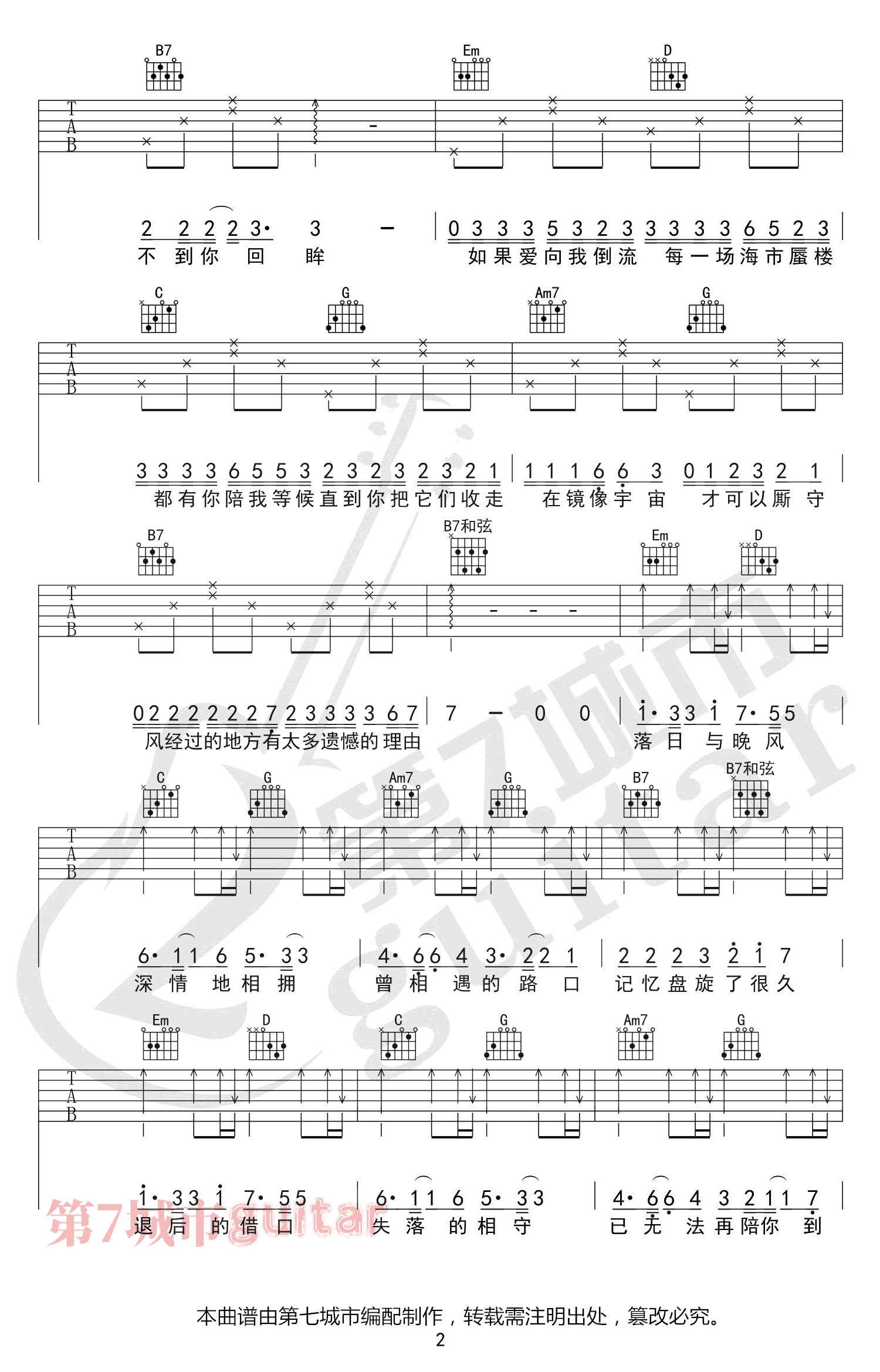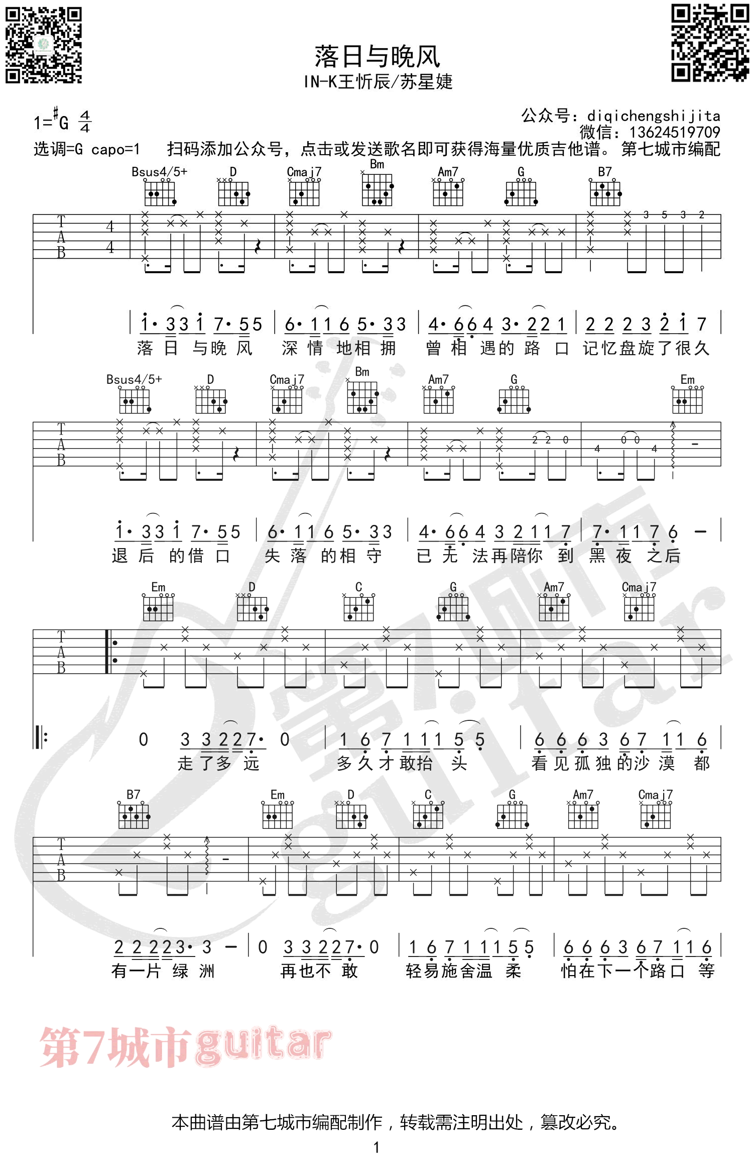 落日与晚风吉他谱 - N - G调吉他弹唱谱
