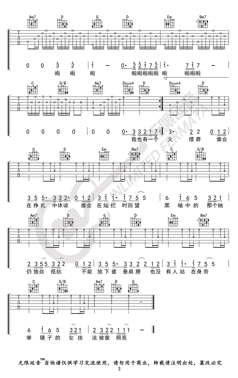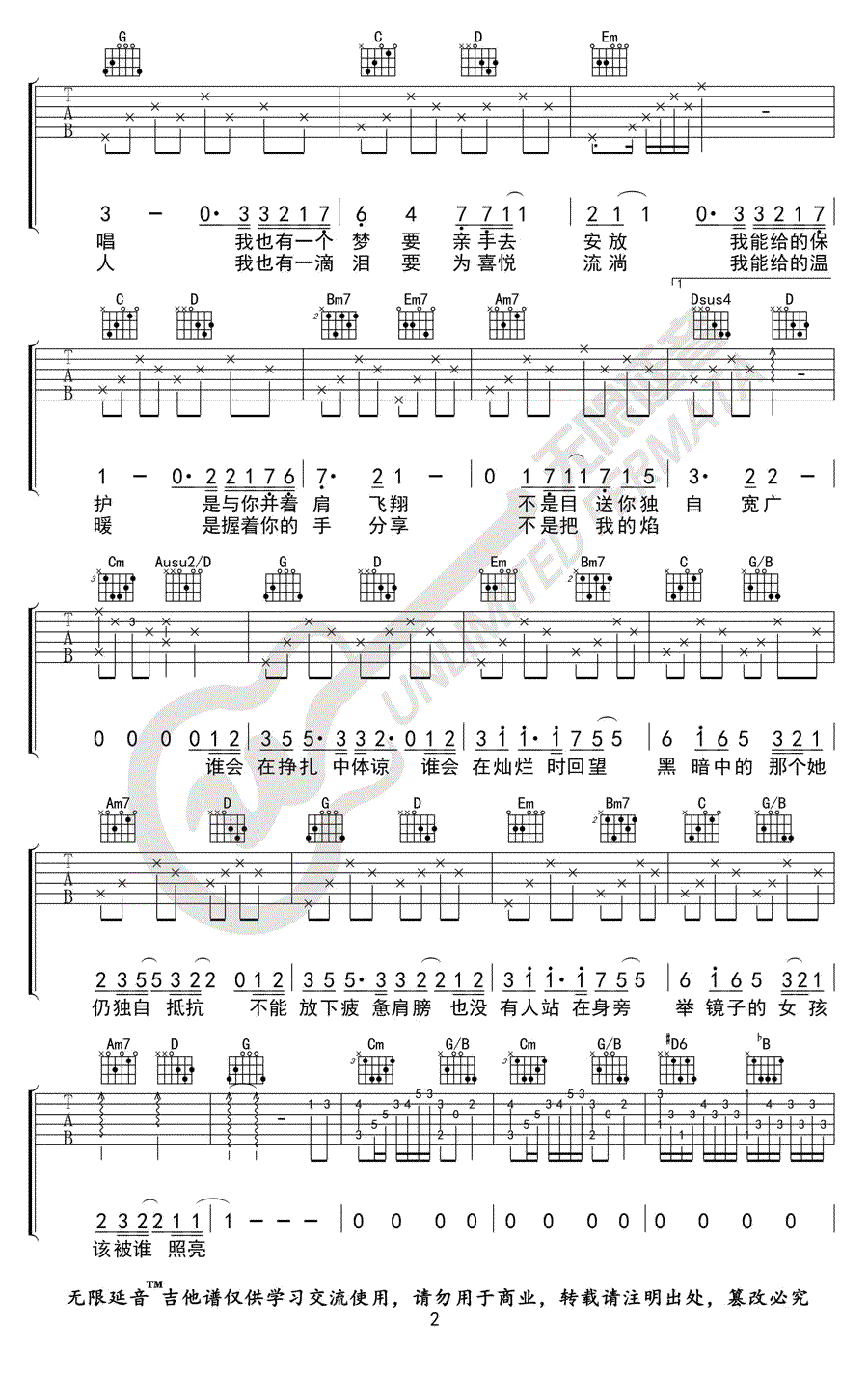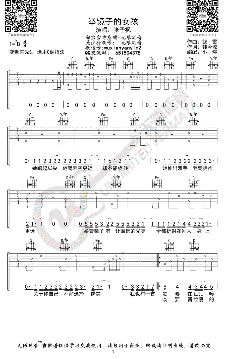 曲谱介绍: 张子枫演唱的电影《我的姐姐》推广主题曲,举镜子的女孩吉他谱,原调bB调,选用G调指法,变调夹夹第三品。举镜子的女孩吉他弹唱谱,三张图片谱。黑暗中的挣扎和孤独最终会被生命中的光治愈,那些成长过程中的痛苦和欢乐、眼泪和汗水都会伴着每一个“她”成为自己生命中的太阳,互相温暖、彼此照亮。