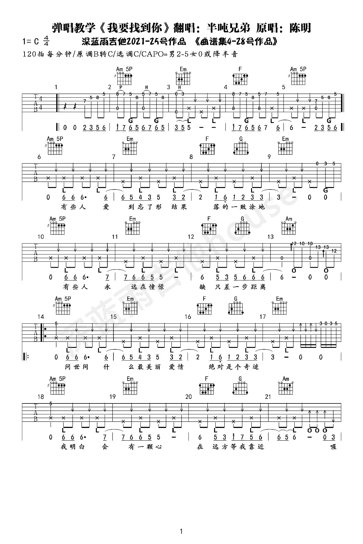 曲谱介绍: 半吨兄弟翻唱歌曲,我要找到你吉他谱,选用C调指法编配,CAPO男生2-5品女生不夹或降半音调弦。我要找到你吉他弹唱谱,三张图片六线谱,深蓝雨吉他编配并带来吉他弹唱视频,同学们可以跟随老师的示范演奏练习。陈明的一首经典老歌,难忘熟悉的旋律带我们回到为爱执着的过去回忆。