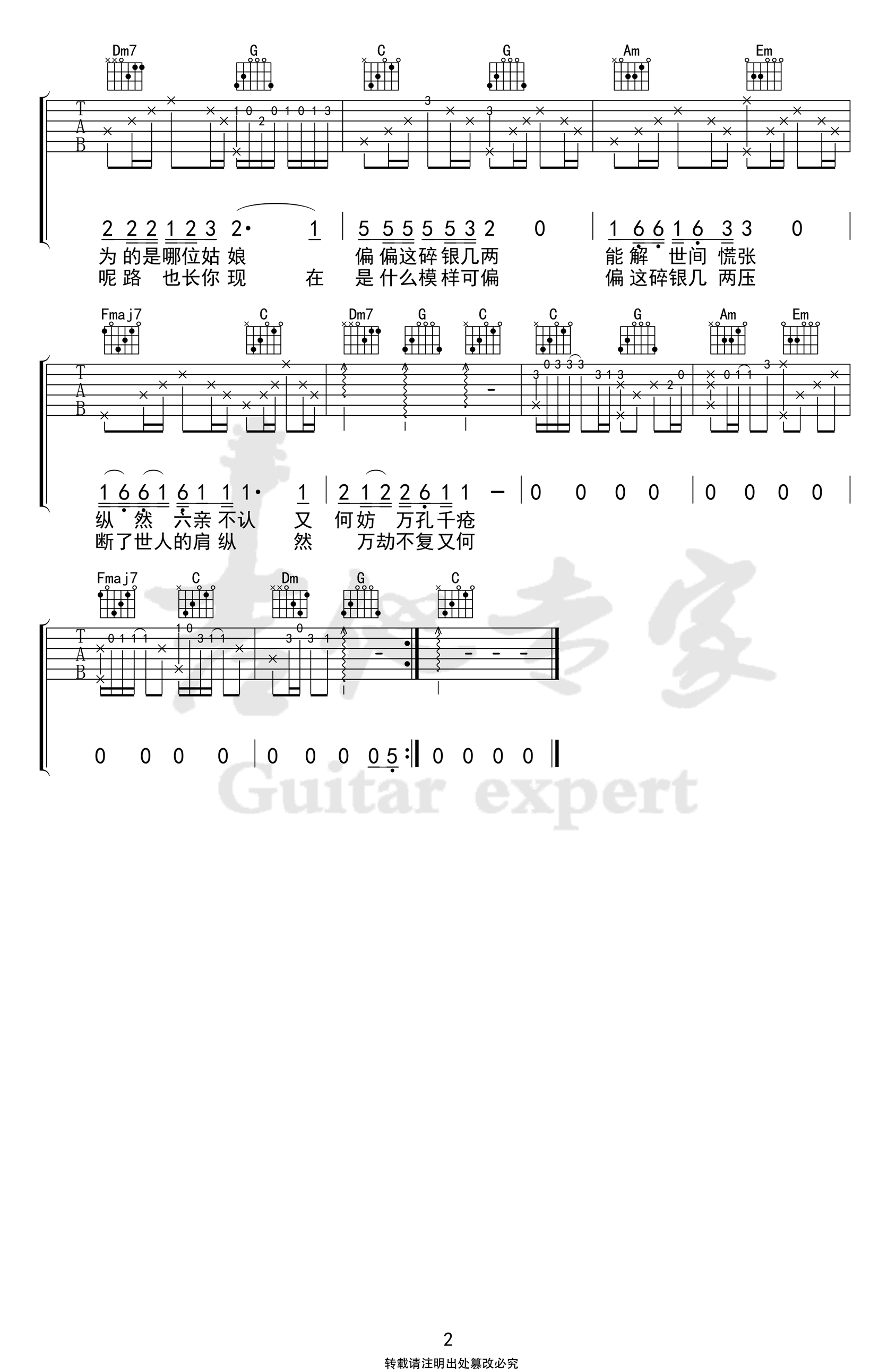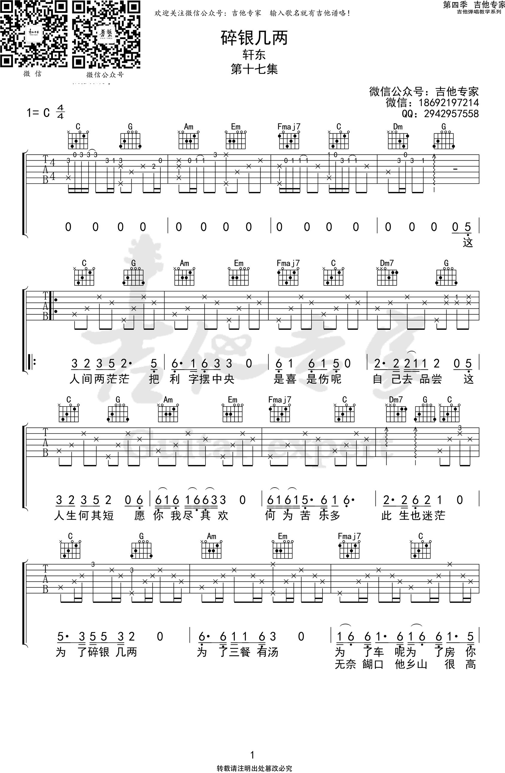 曲谱介绍: 轩东《碎银几两》吉他弹唱谱,采用C调指法编配,共有2张高清图谱,免翻页排版设计。