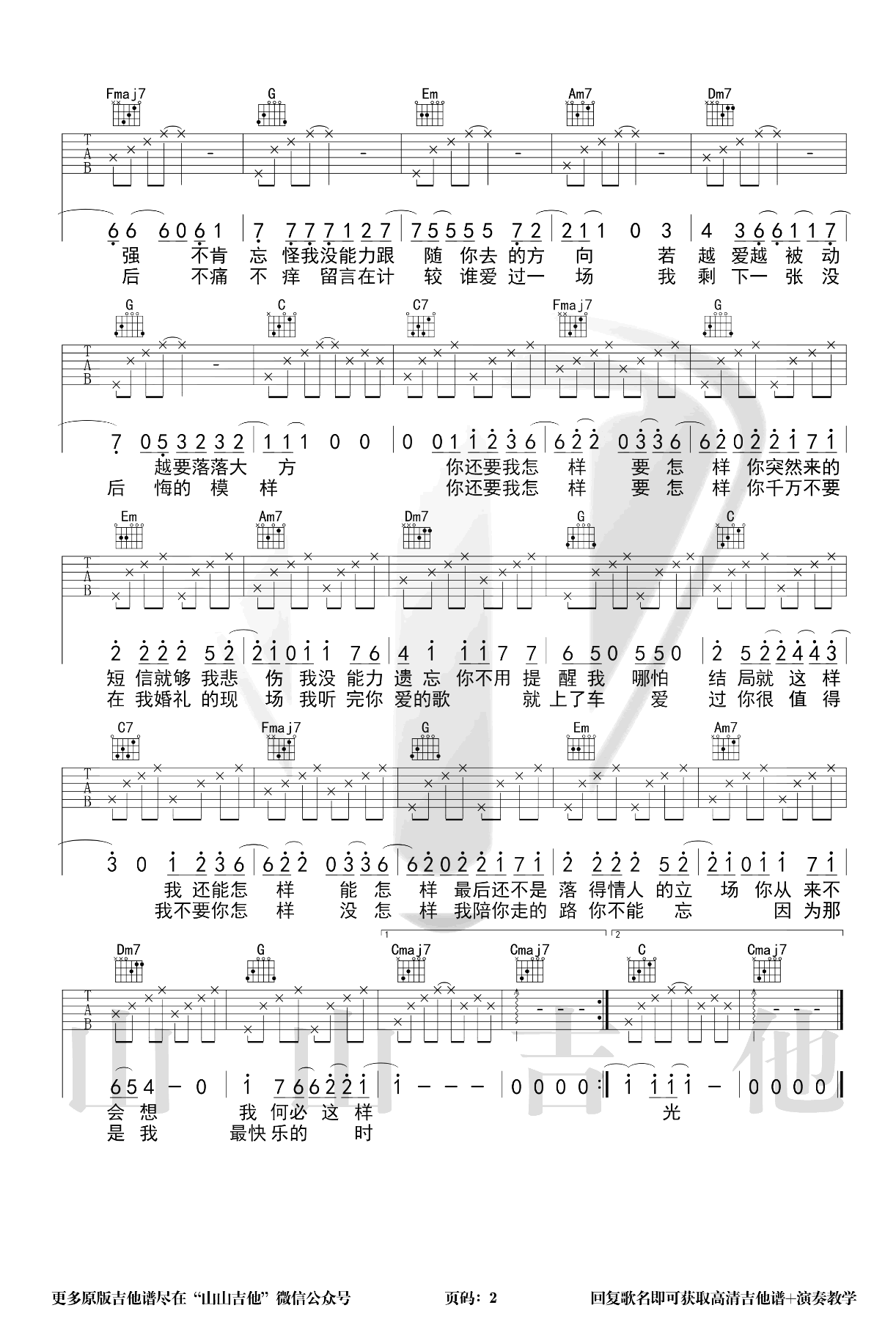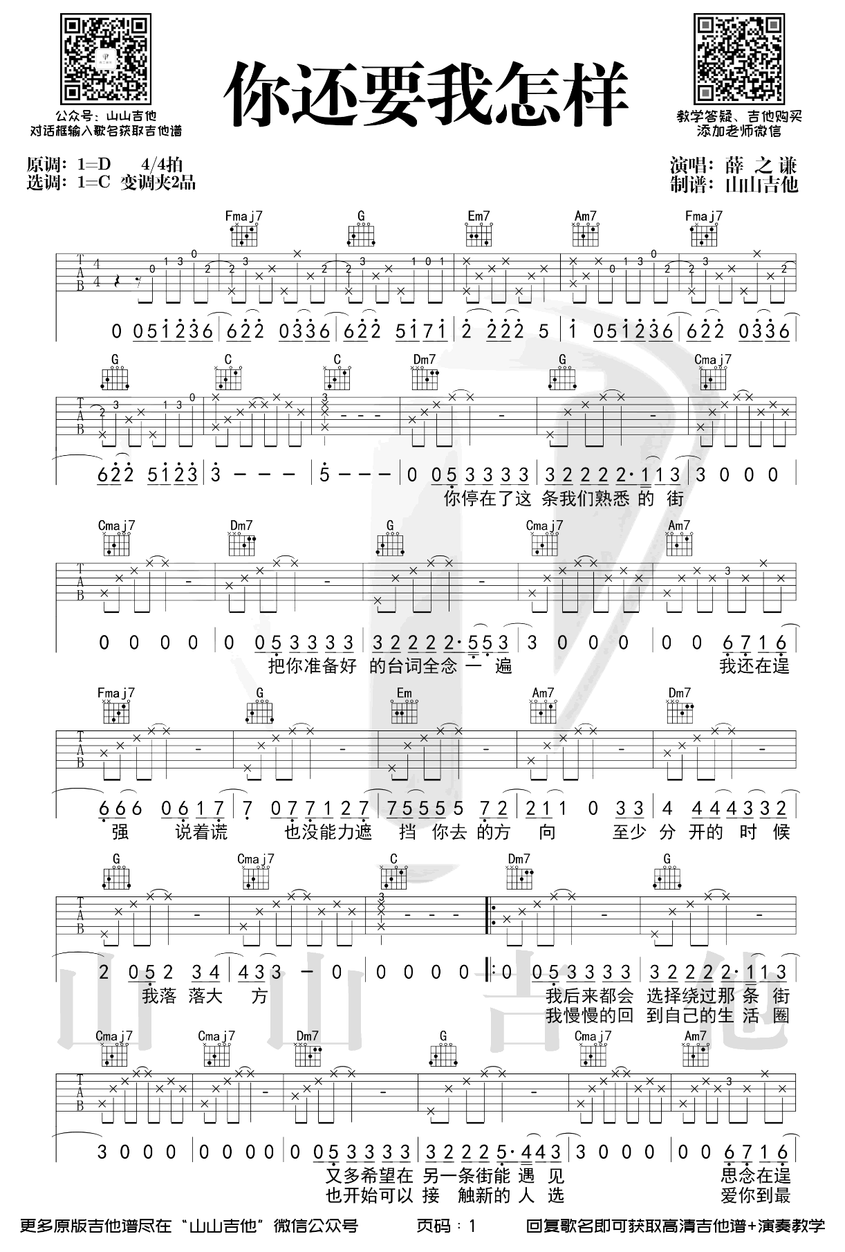 曲谱介绍: 薛之谦的一首经典情歌作品,伤感的歌声娓娓诉说着充满遗憾和无奈的爱情故事。你还要我怎样吉他谱,原调D选调C,变调夹夹二品,两张图片谱。随谱附上《你还要我怎样》吉他弹唱教学视频,曲谱和弦简单,适合新手学习,同学们跟随老师的示范讲解练习起来吧。