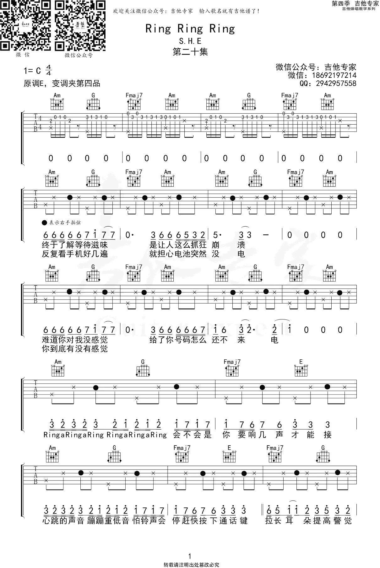 曲谱介绍: Ring Ring Ring吉他谱,S.H.E的一首老歌,因着网络短视频平台翻唱重新走红。Ring Ring Ring吉他弹唱谱,C调指法编配。变调夹夹四品,两张图片谱例。轻快活泼的旋律,朗朗上口的歌词,整首歌也因此听来相当可爱俏皮,听多了真的很上头。