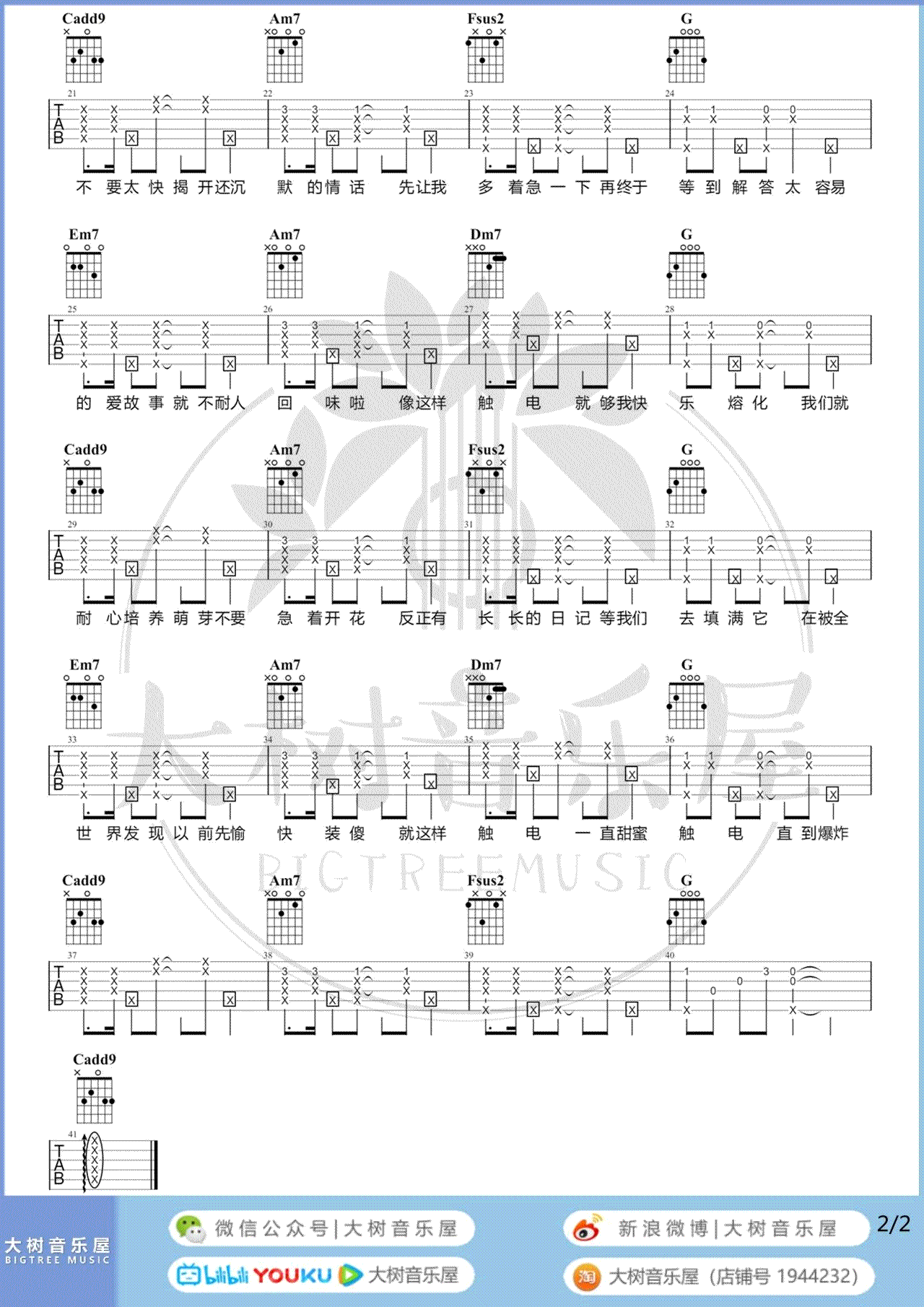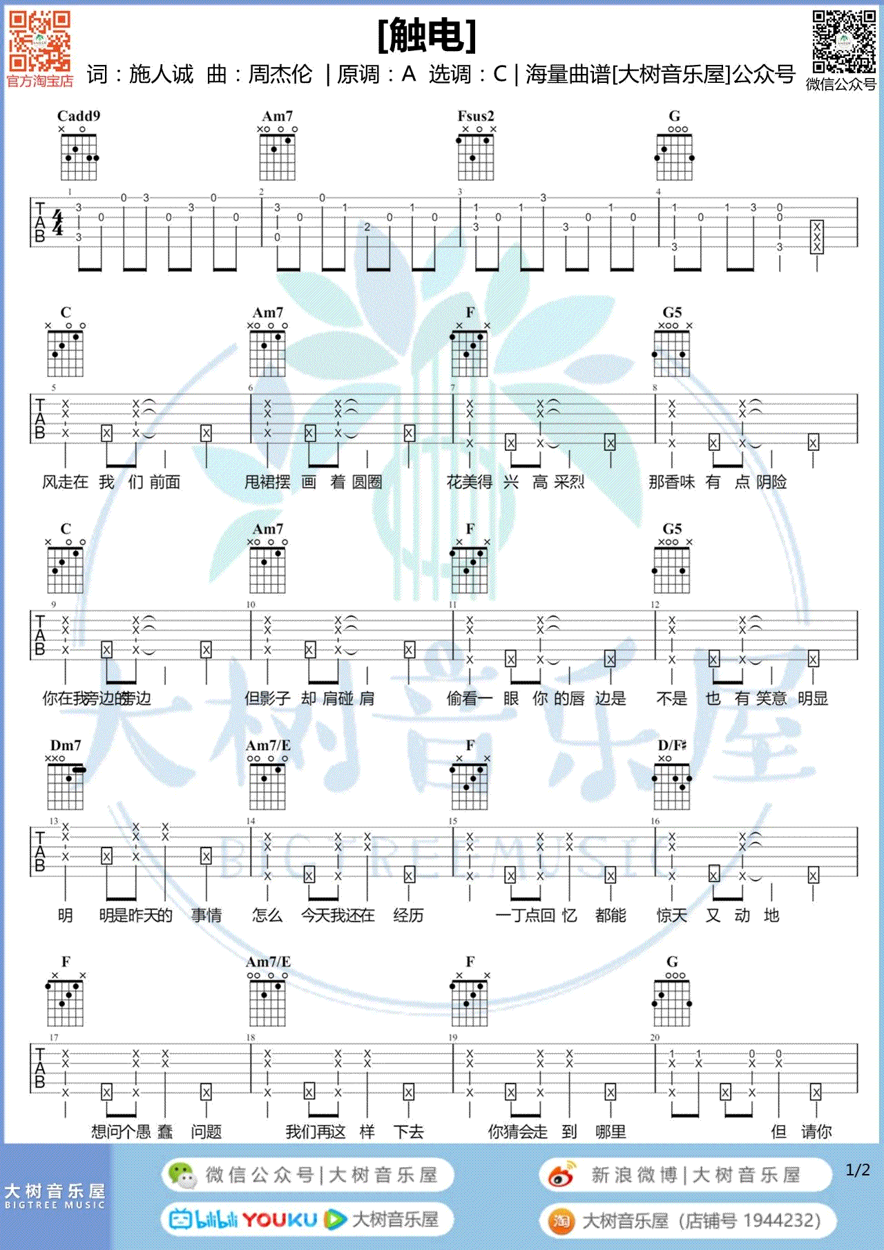 曲谱介绍: S.H.E《触电》吉他弹唱谱,采用C调指法编配,共有2张高清图谱,免翻页排版设计。
