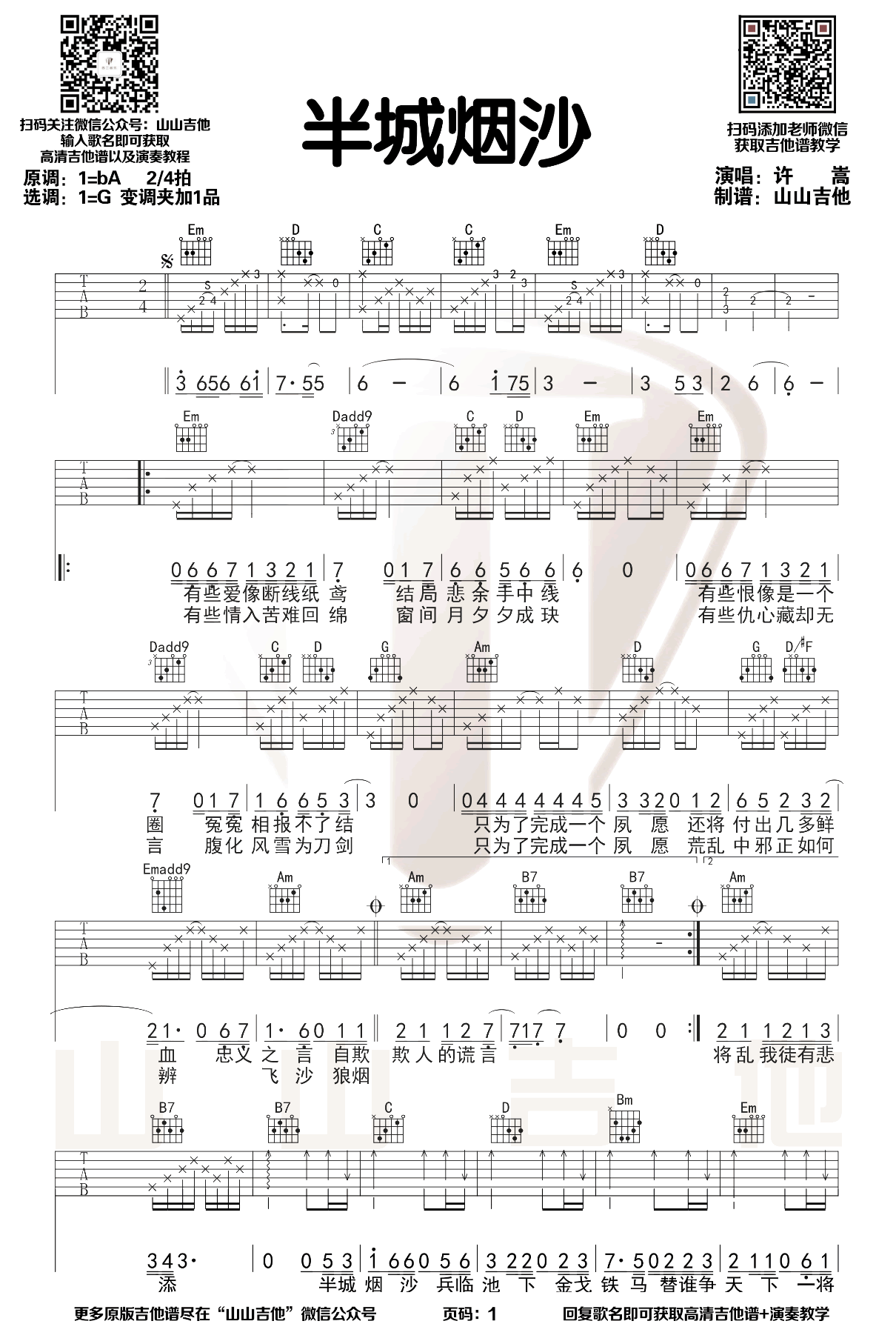 曲谱介绍: 许嵩一首非常好听的歌曲,半城烟沙吉他谱,原调bA,选调G和弦超原版编配,变调夹加一品,两张图片六线谱。