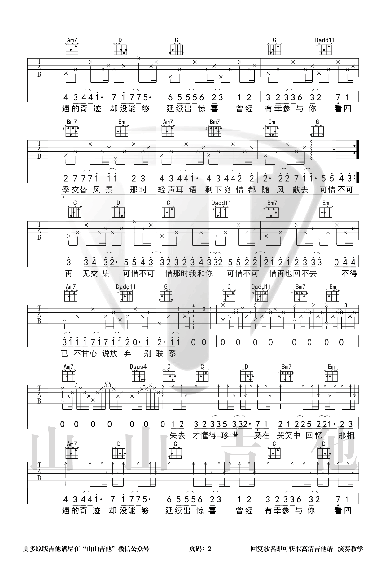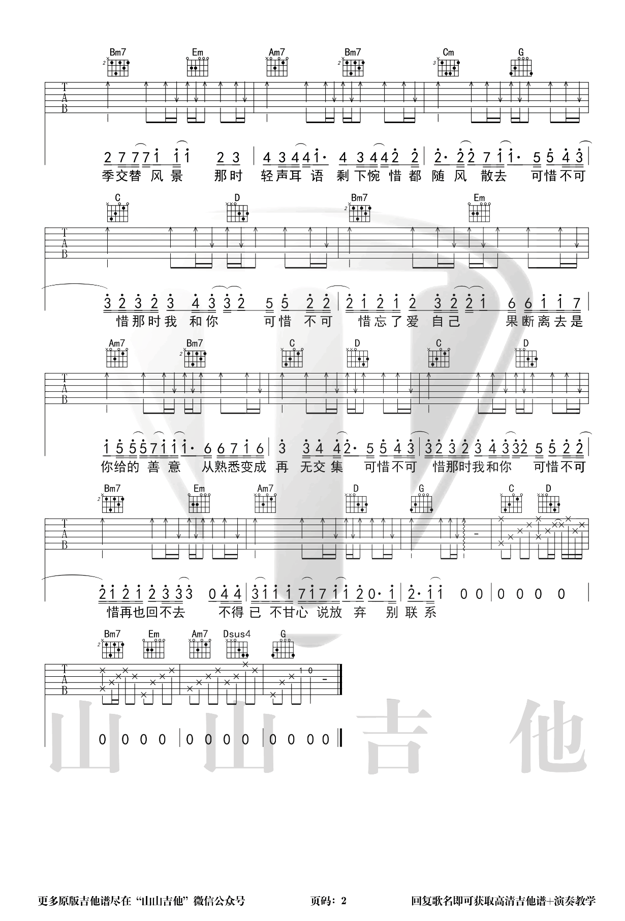 曲谱介绍: 刘大壮的一首歌曲,可惜不可惜吉他谱,选用G调和弦指法编配,变调夹一品,三张图片六线谱。