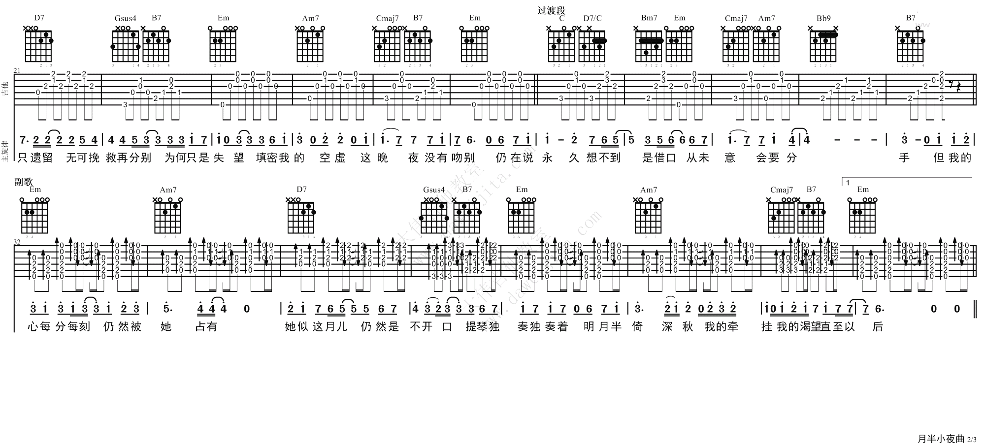 曲谱介绍: 李克勤的一首经典粤语歌曲,月半小夜曲吉他谱,原调降B,曲谱选用了G调指法编配,变调夹夹第三品,三张高清图片六线谱。