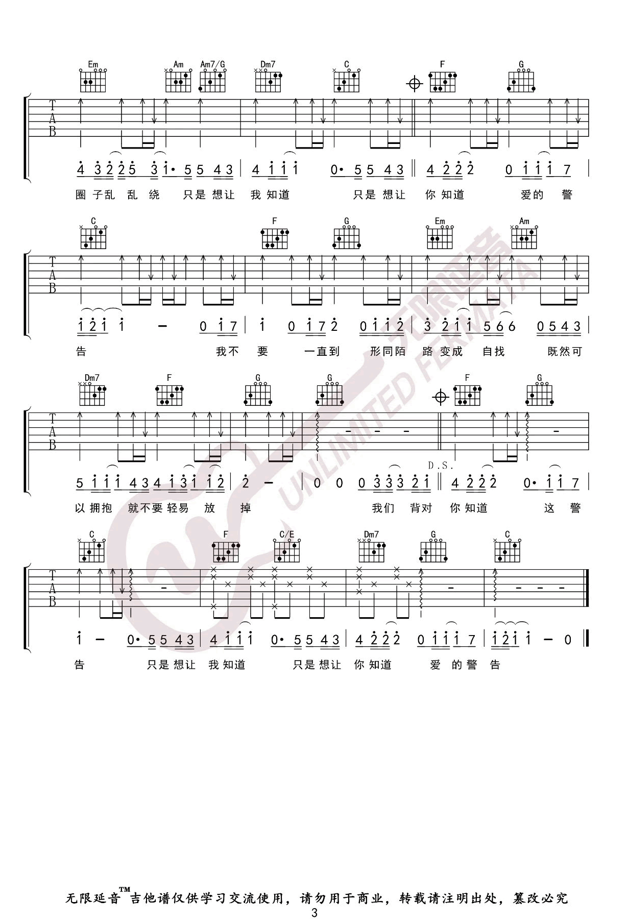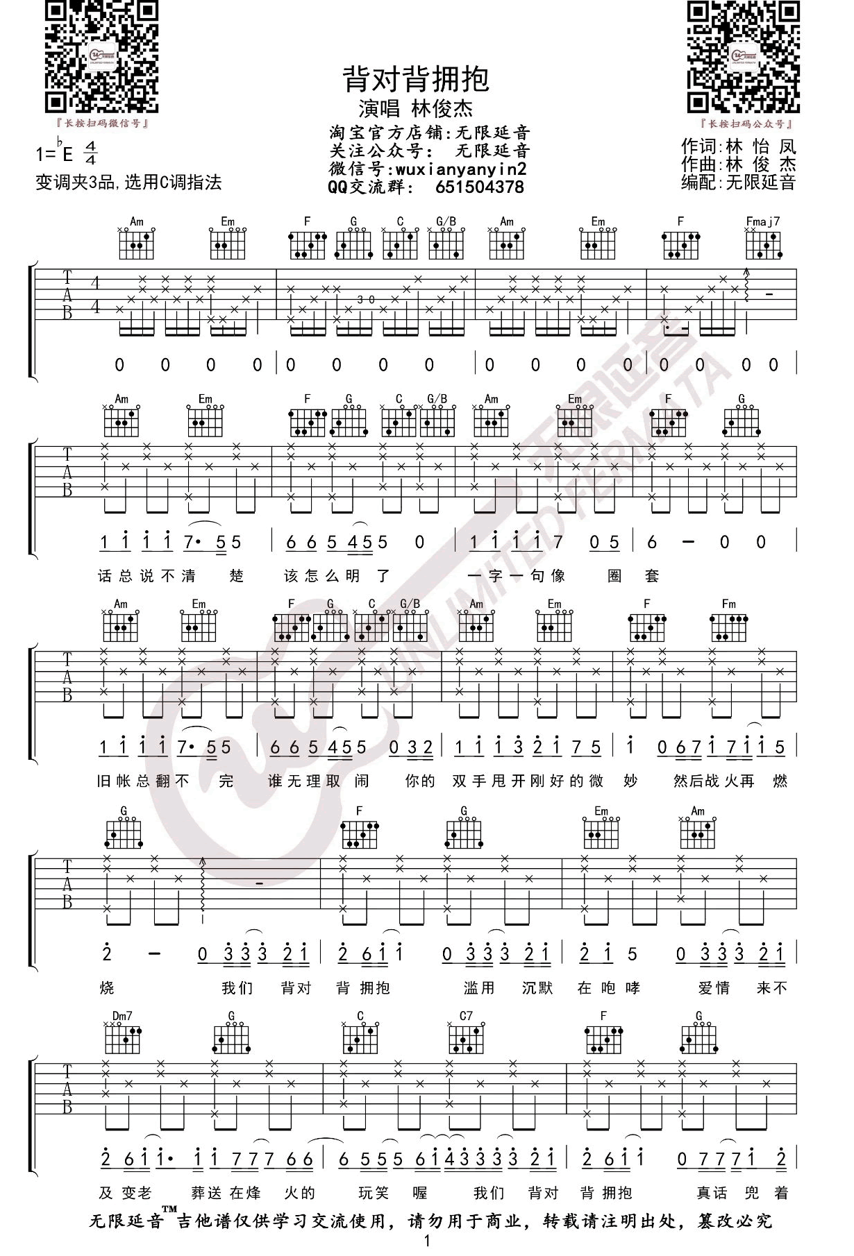曲谱介绍: 林俊杰的一首经典情歌,背对背拥抱吉他谱,原调降E调,选用C调指法,变调夹夹三品,三张图片六线谱。