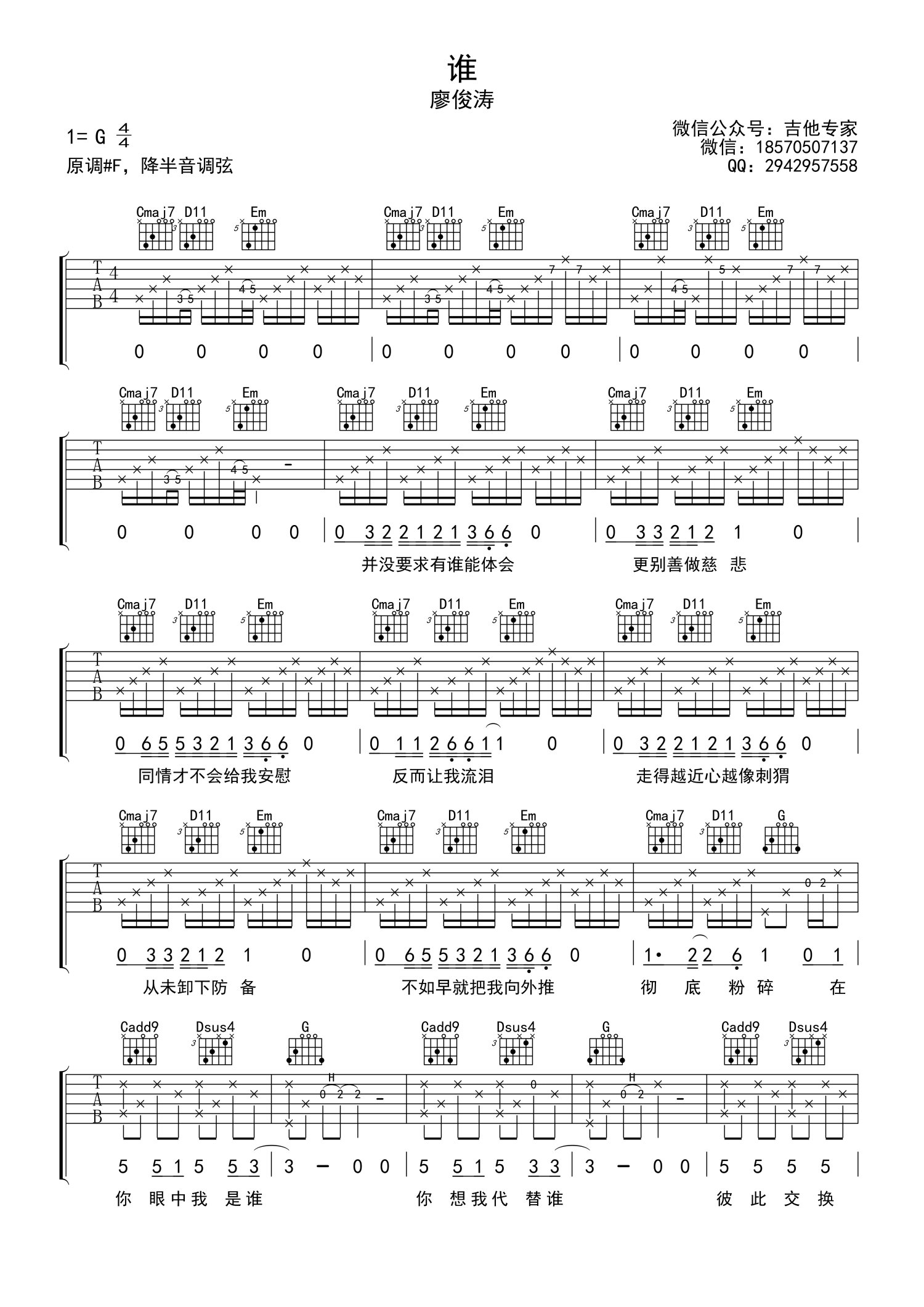 • 谁吉他谱 - 廖俊涛 - G调吉他弹唱谱 - 简易版第1张
