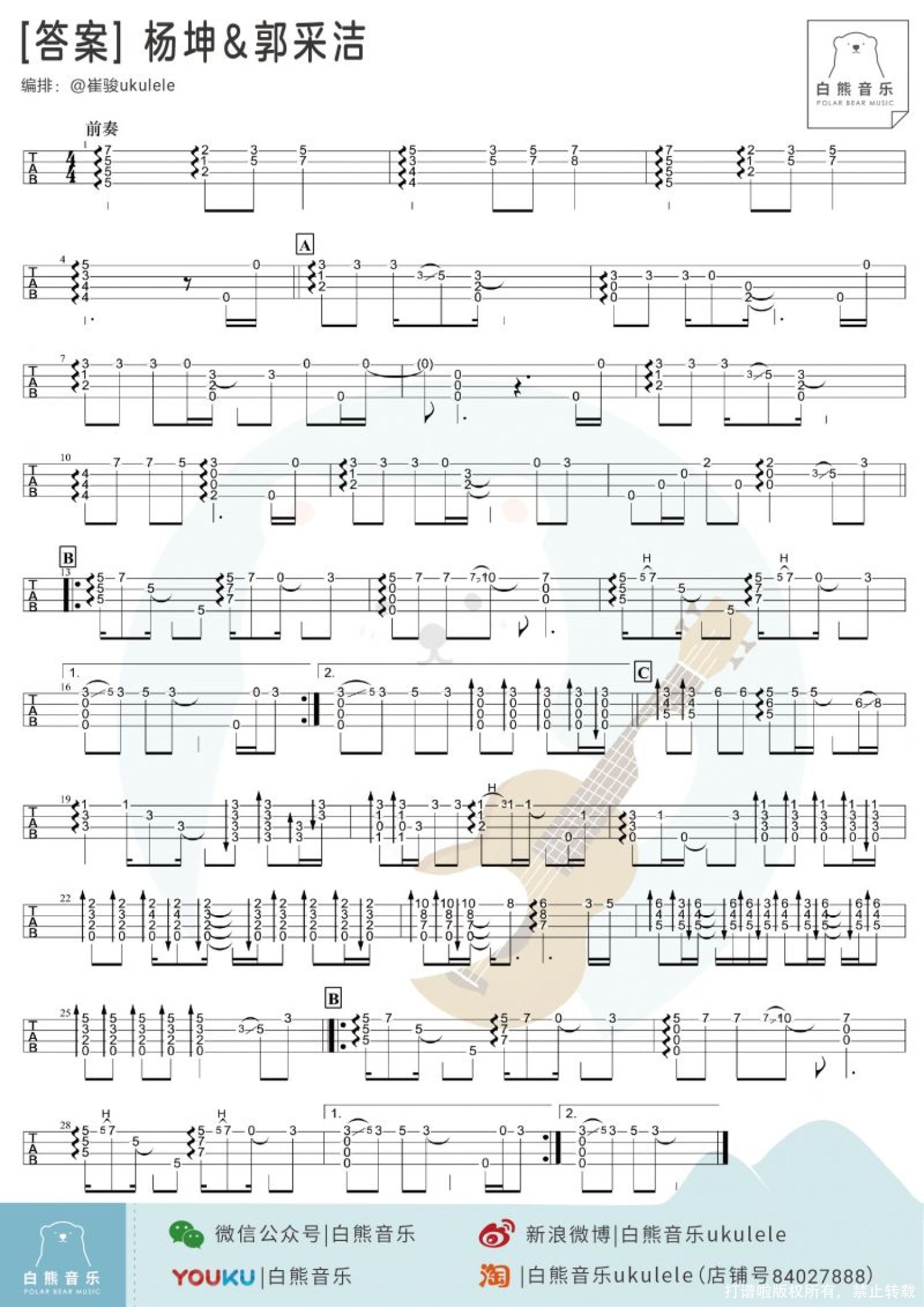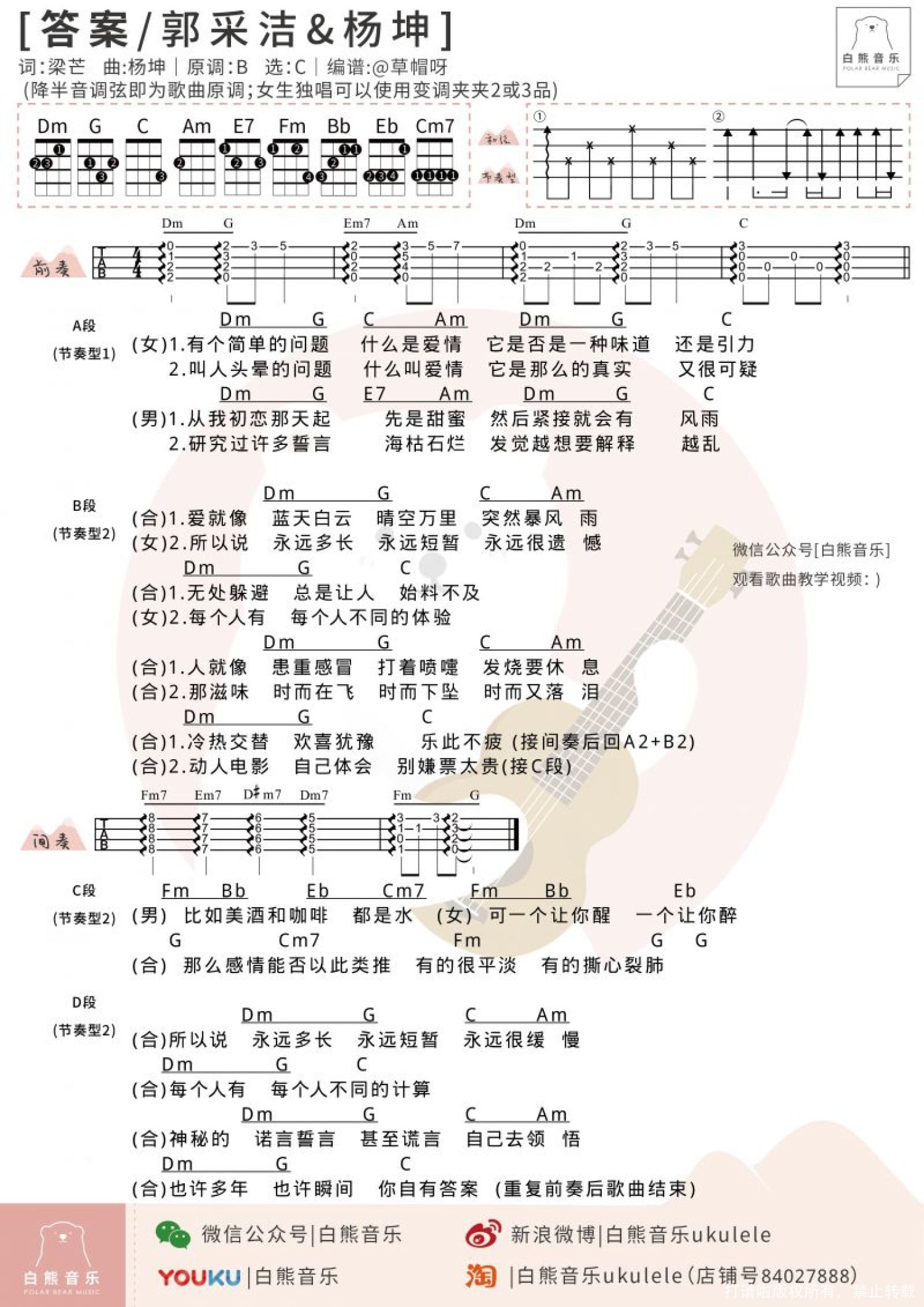 答案尤克里里谱 - 杨坤/郭采洁