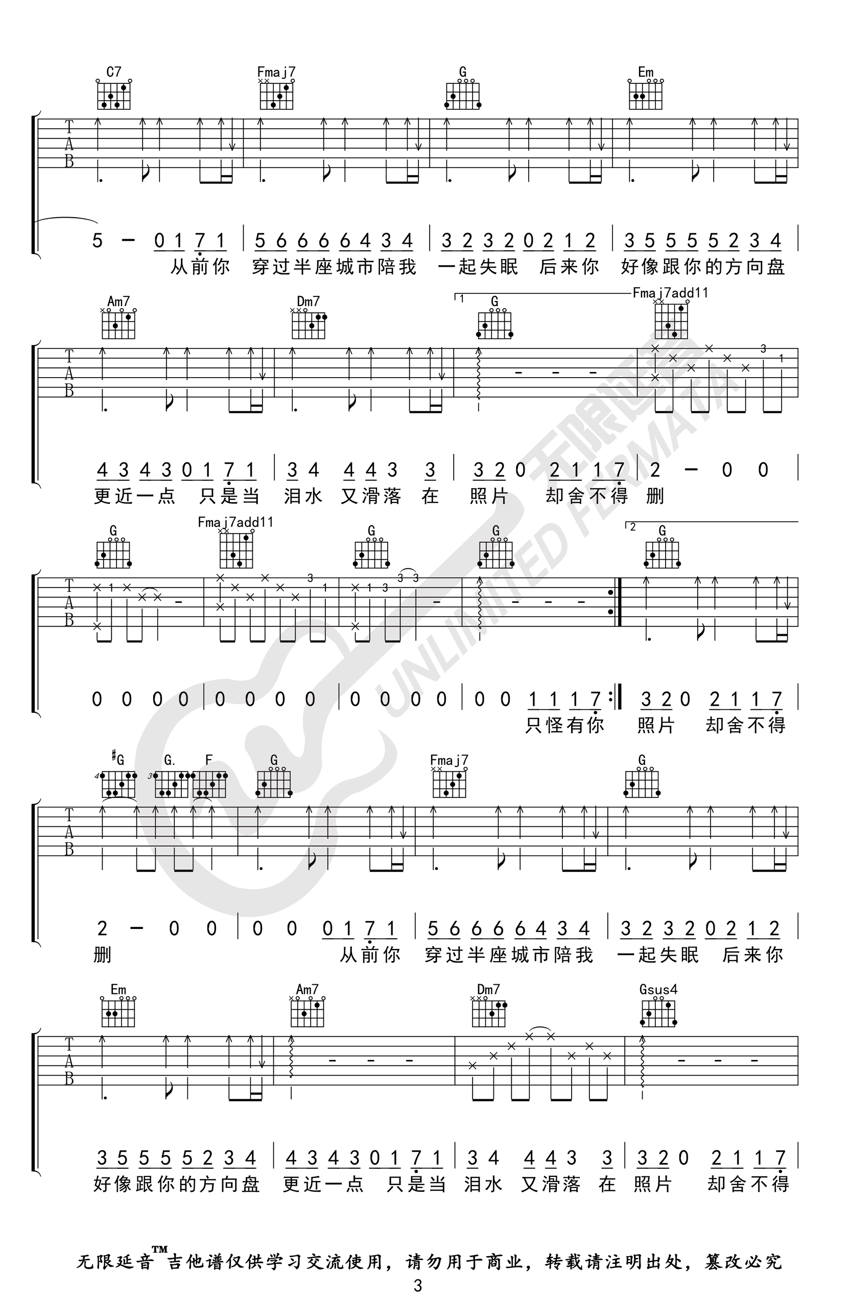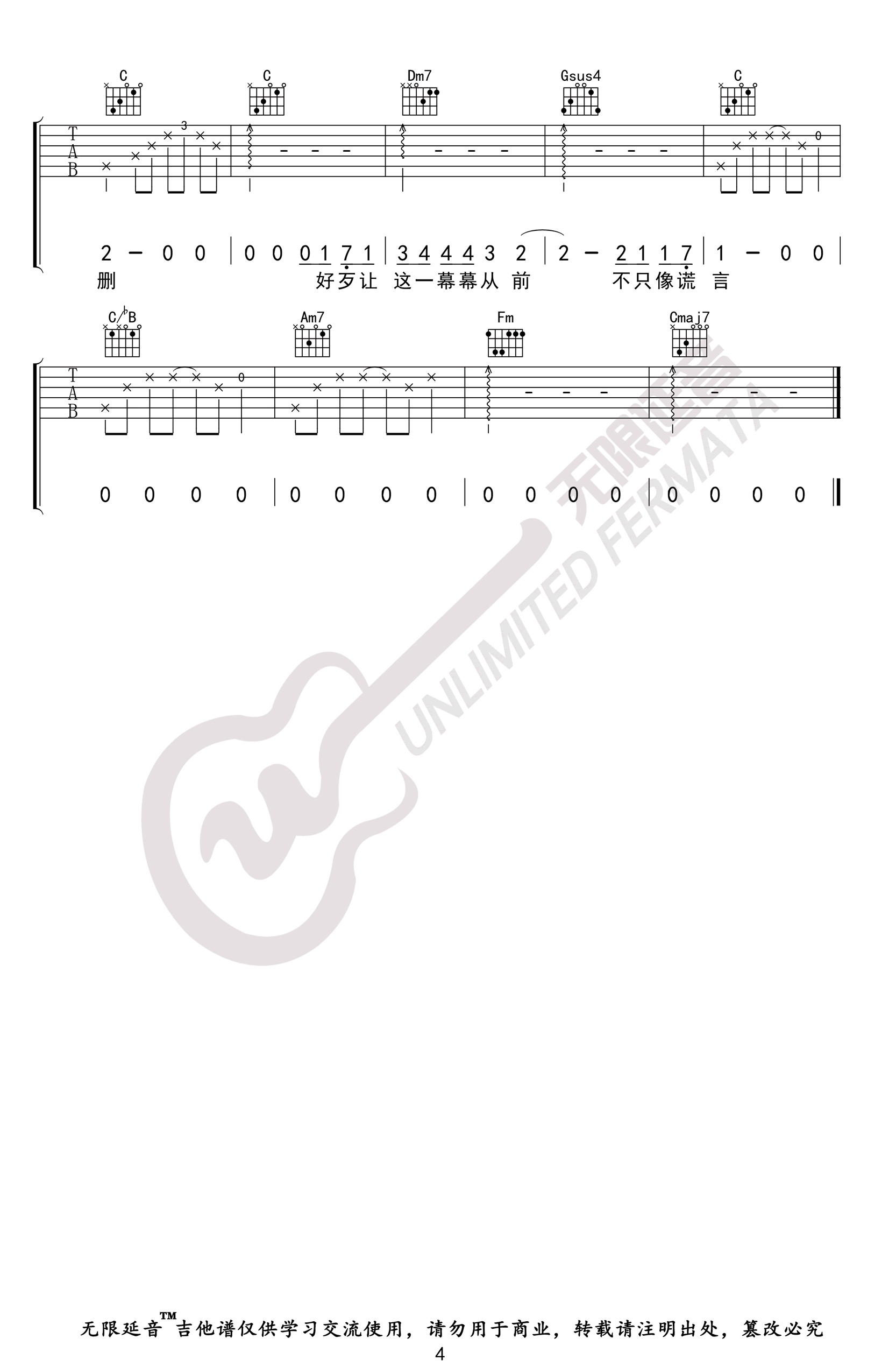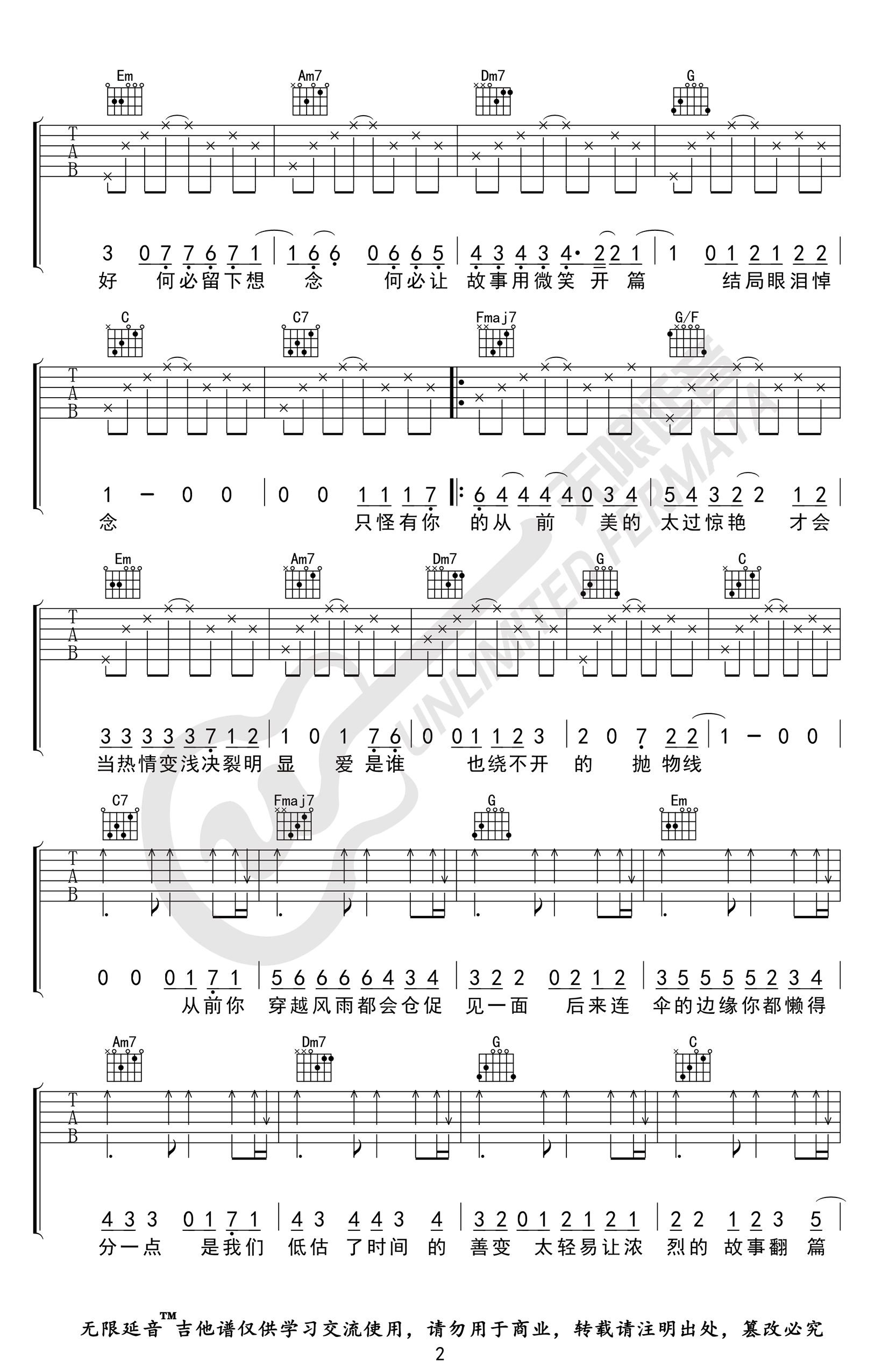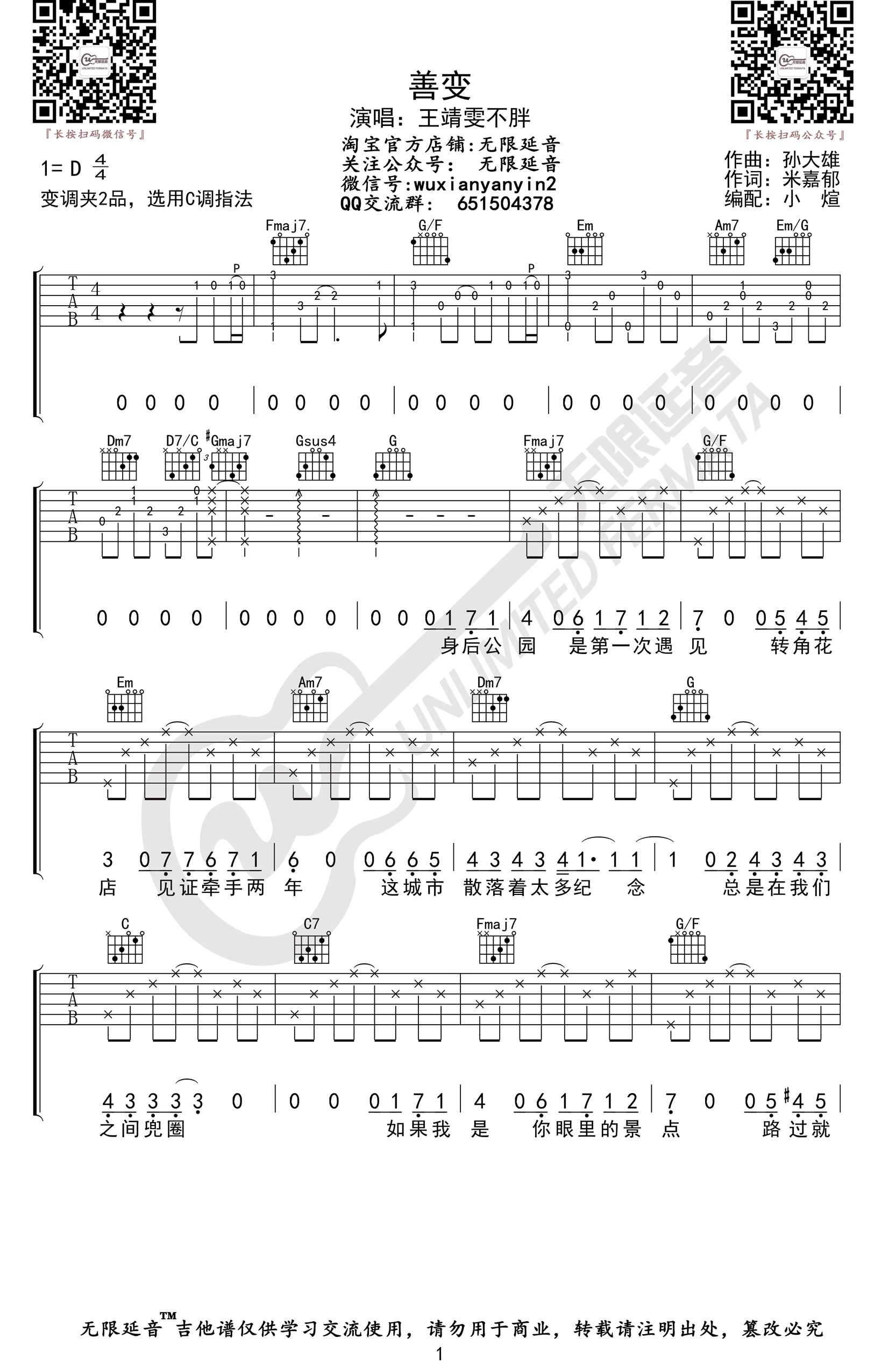 曲谱介绍: 王靖雯不胖的一首网络热门歌曲,善变吉他谱,原调D,变调夹夹二品,选用C调指法,完整编配共四张高清图片谱。