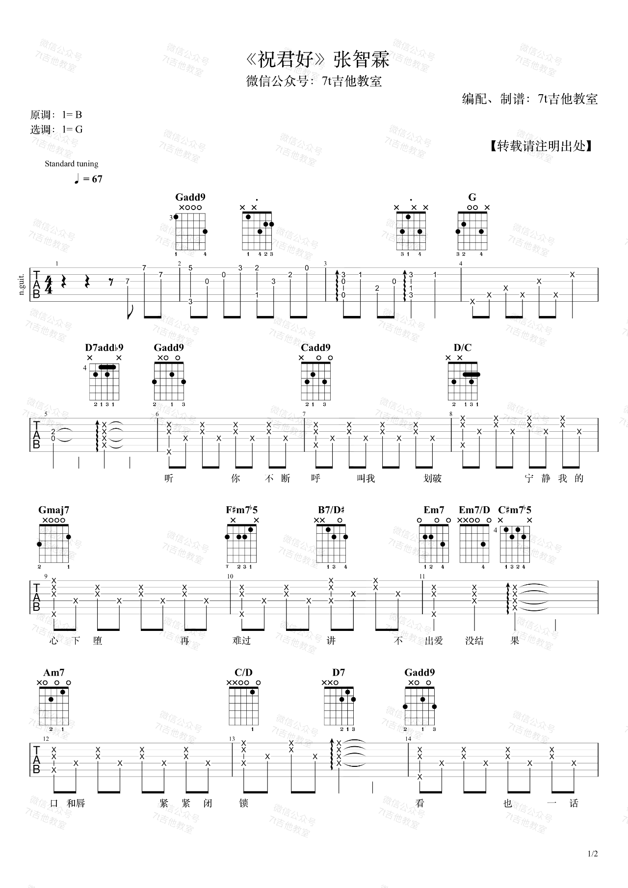 曲谱介绍: 张智霖的一首经典粤语歌曲,祝君好吉他谱,这首歌的原调是B大调,《祝君好》吉他弹唱演示用的是G大调的指法来编配,视频里是标准音调弦,没有使用变调夹,同学们如果想弹原调,可以夹第4品。电影《十月初五的月光》主题曲,陈洁仪、侧田、赵学而等歌手不同演绎版本,听着这首歌,整个人都感觉安静下来了。