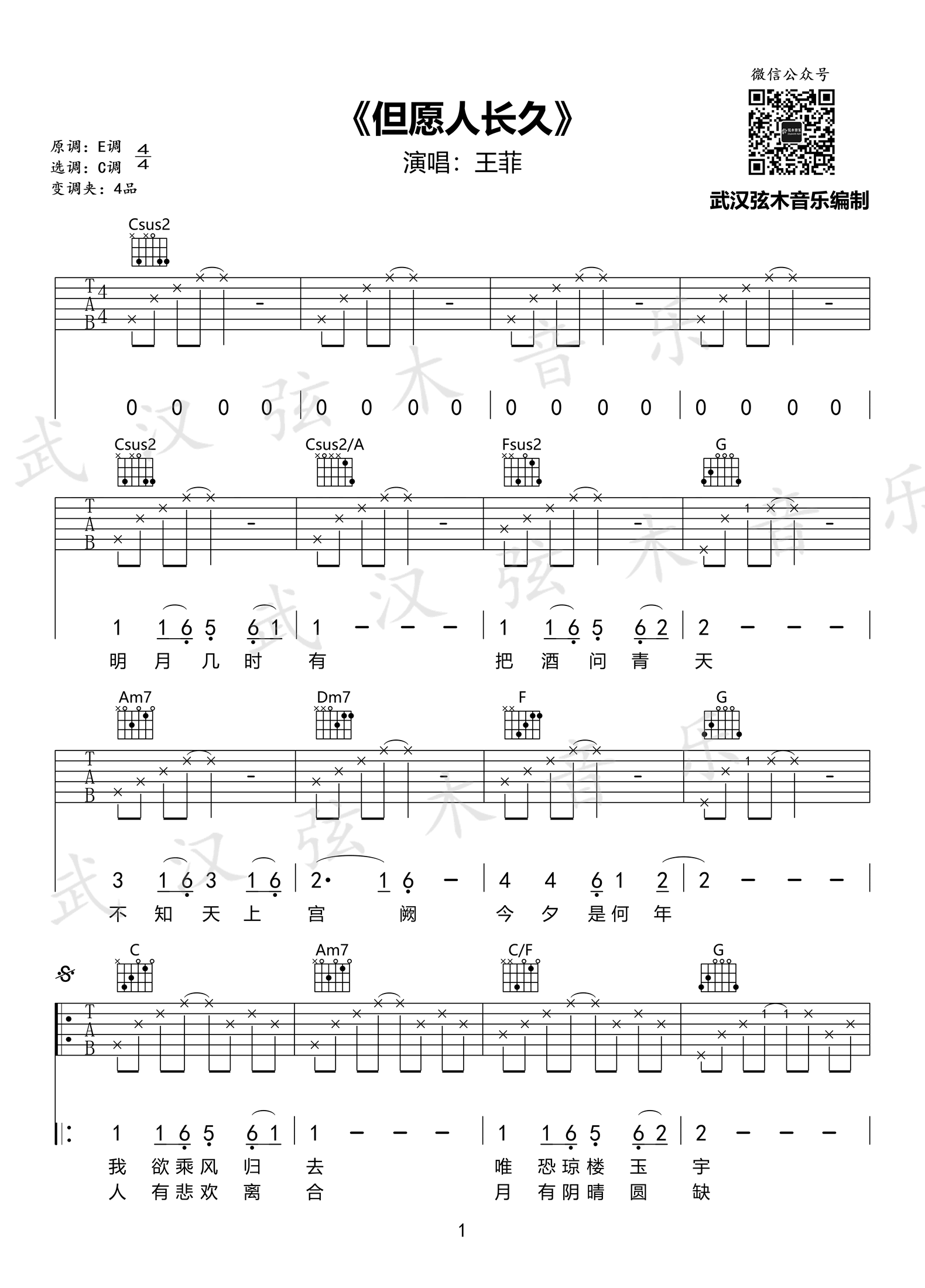 曲谱介绍: 王菲/邓丽君《但愿人长久》吉他弹唱谱,采用C调指法编配,共有2张高清图谱,免翻页排版设计。