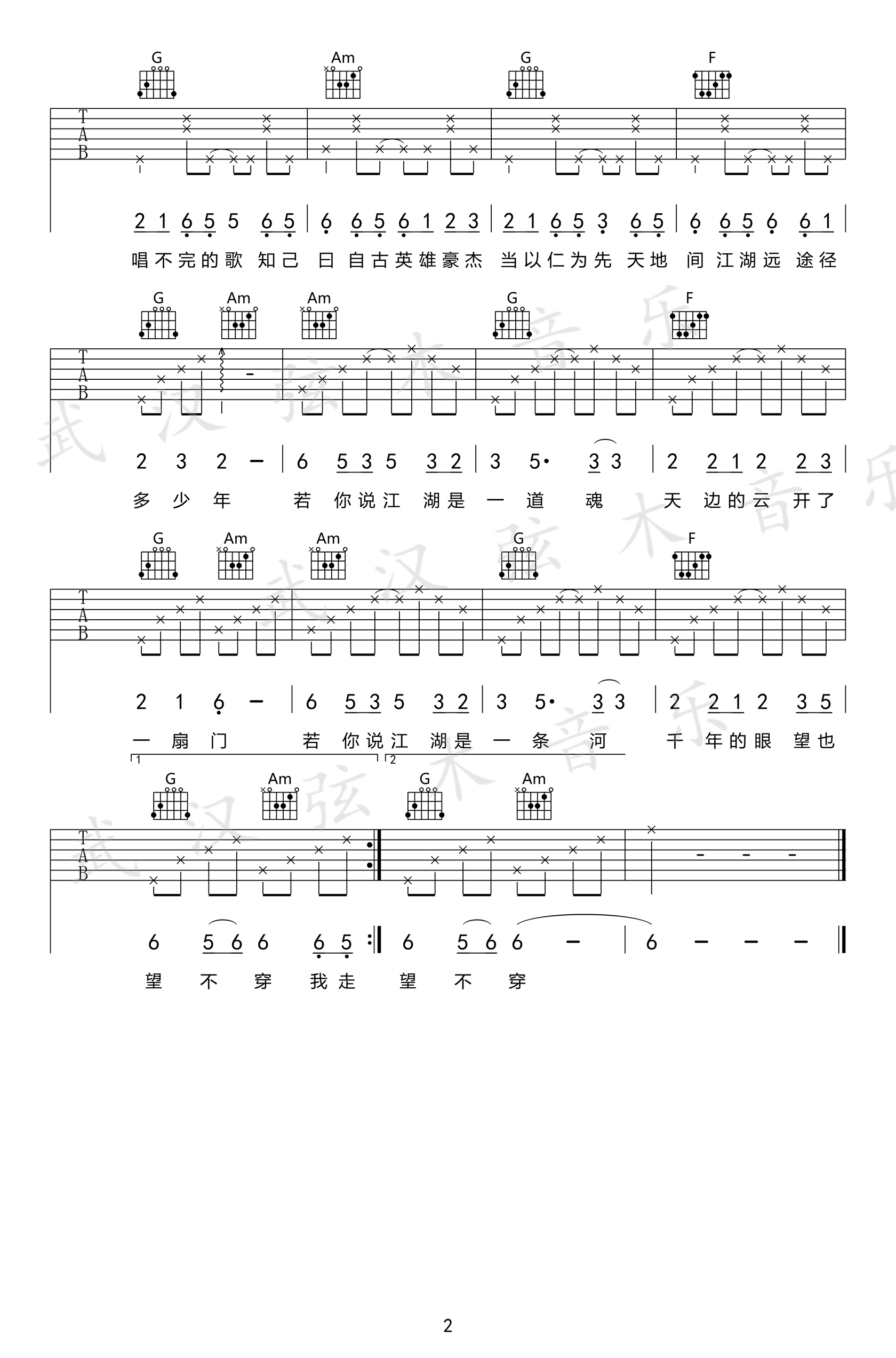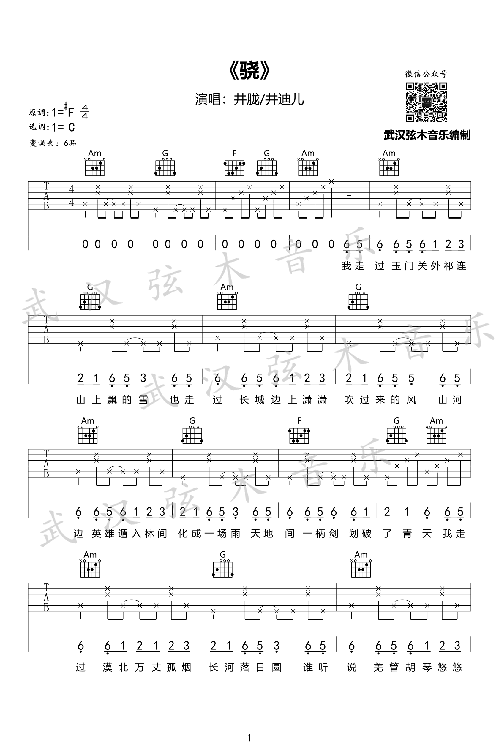 曲谱介绍: 井胧井迪儿合唱的一首古风歌曲,《骁》吉他谱,原调升F选调C,变调夹夹六品,两张高清弹唱图片谱。