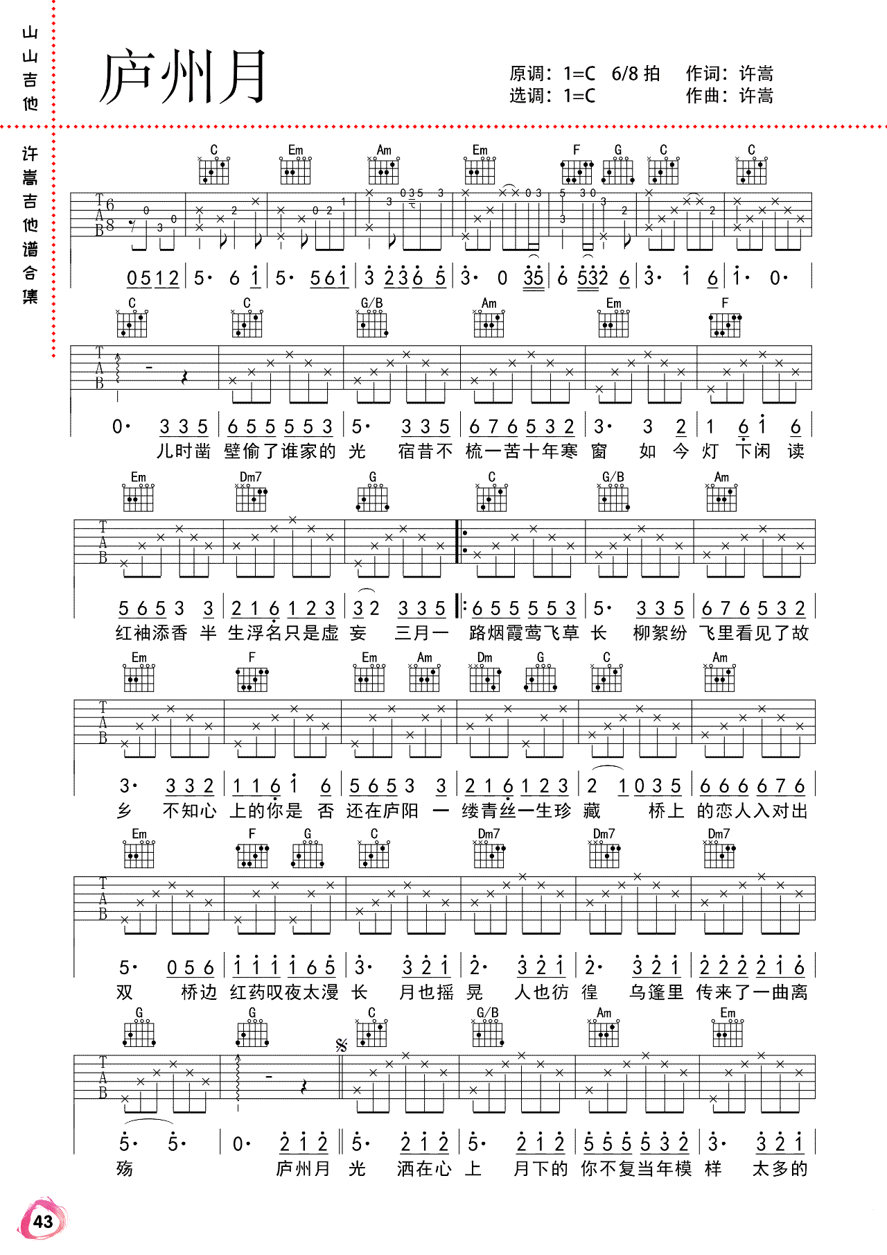 曲谱介绍: 许嵩《庐州月》吉他弹唱谱,采用C调指法编配,共有2张高清图谱,免翻页排版设计。