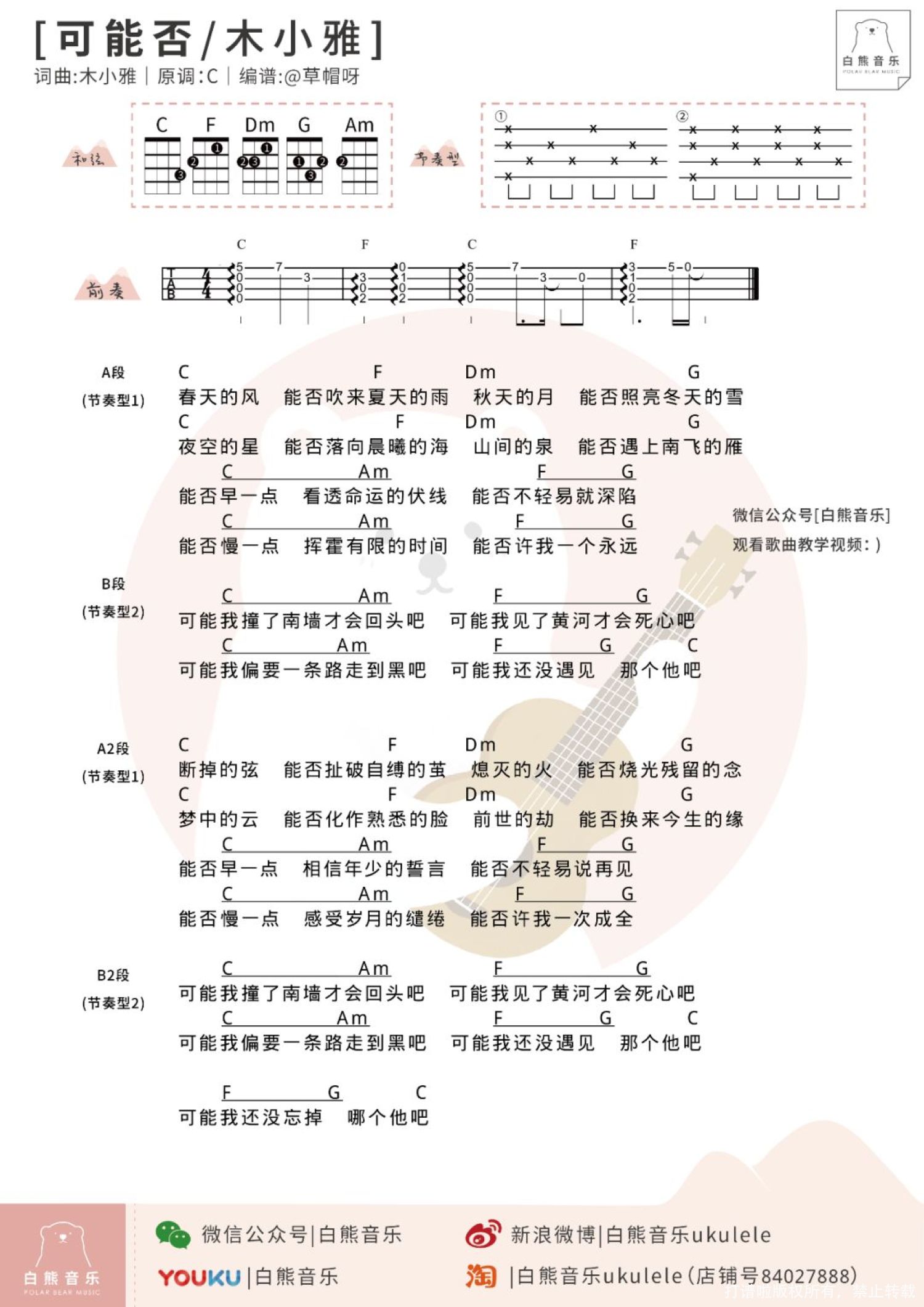 曲谱介绍: “能否慢一点,挥霍有限的时间。能否不轻易就深陷。” ◎〈可能否〉是木小雅演唱的歌曲,同时这个也是作为网易云音乐“石头计划”第二季的第二首原创作品,其明快清澈的旋律加之深入人心的歌词,获得一致好评; ◎据木小雅介绍,〈可能否〉这首歌曲,灵感来自于诗人张枣在《镜中》的那句:“每当想起一生中后悔的事,梅花便落满了南山。”木小雅想通过〈可能否〉这首歌,表达自己对人生相遇与错过的态度。同张枣一样,木小雅在歌词中描述着那些错过的迷惘:“能否早一点,相信年少的誓言,能否不轻易说再见。”同时,她也写出自己的倔强与执拗:“可能我撞了南墙才会回头吧,可能我偏要一条路走到黑吧”......这些歌词,也是木小雅创作之路的写照。   Ukulele弹唱教学|@草帽呀   尤克里里谱
