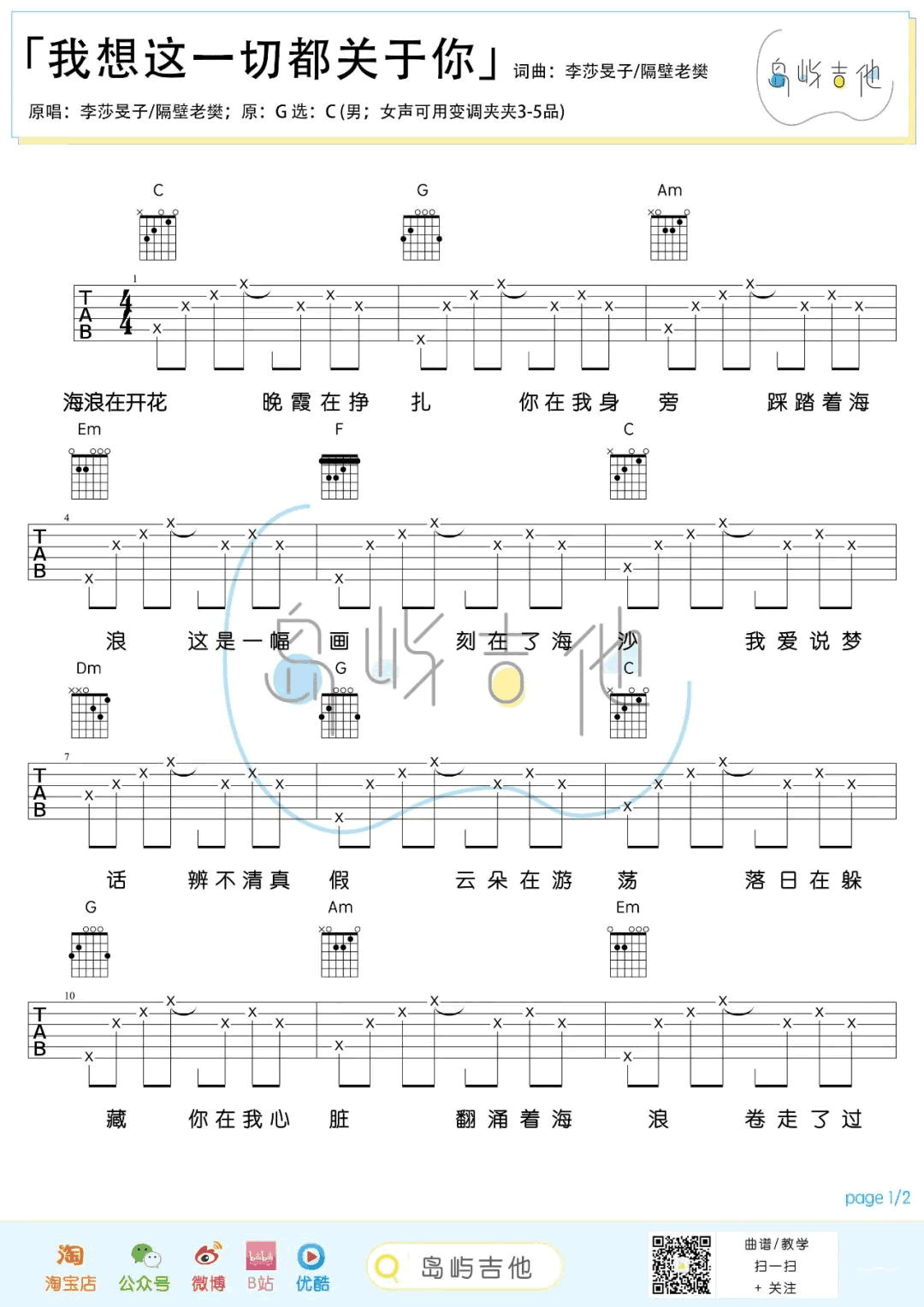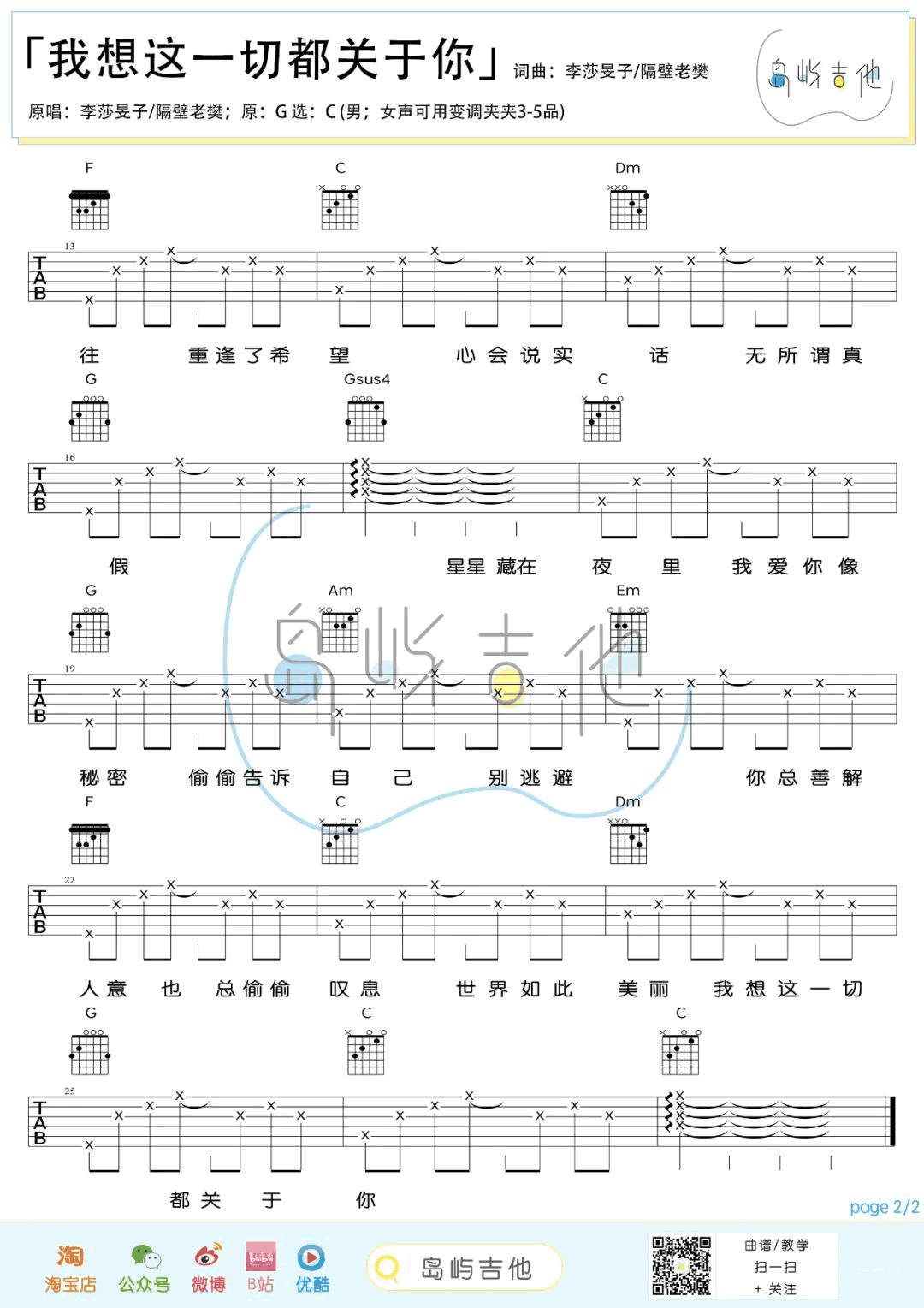 曲谱介绍: 我想这一切都关于你吉他谱,隔壁老樊/李莎旻子在《女儿们的恋爱》节目演唱的一首甜蜜情歌,两个人在沙滩上弹唱的画面,太浪漫啦。《我想这一切都关于你》吉他弹唱谱,原调G选调C,女生可以用变调夹夹3-5品,两张图片六线谱。