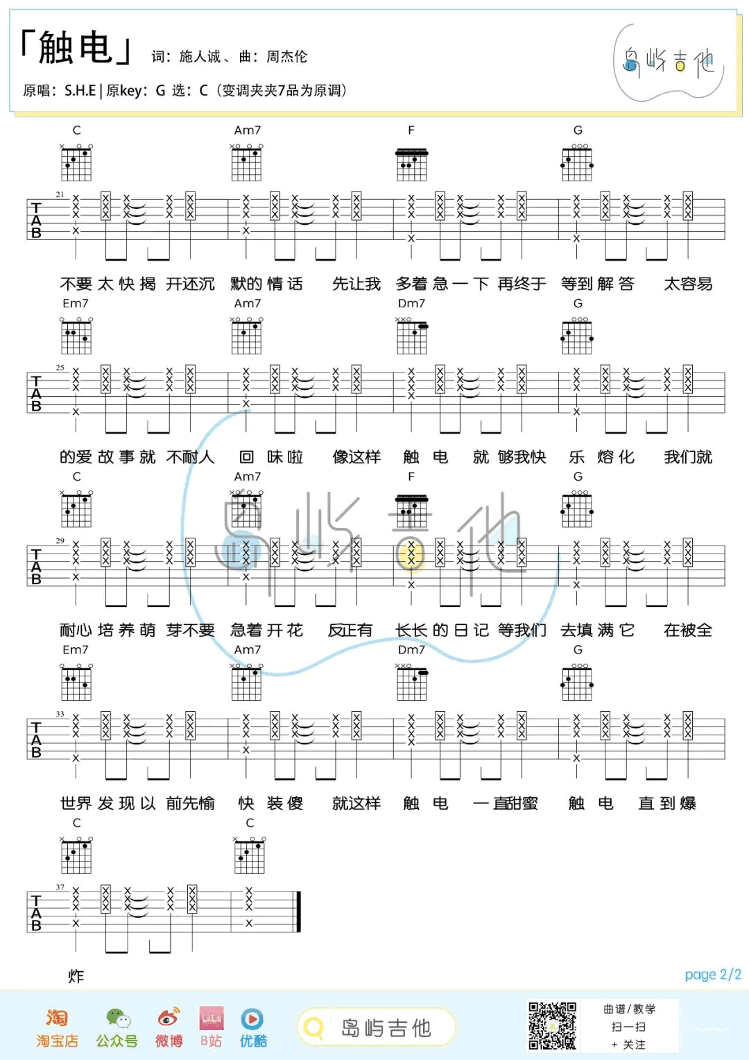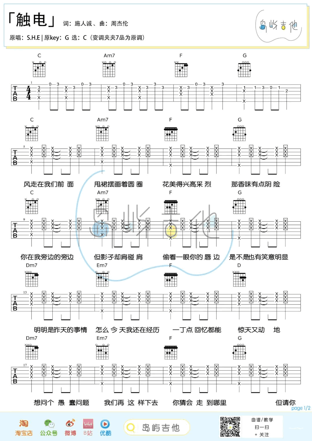 曲谱介绍: S.H.E的一首经典老歌,触电吉他谱,原调G,选调C,变调夹夹七品为原调。《触电》吉他弹唱谱,三张图片谱。这首歌是周杰伦特别为S.H.E所写的一首甜蜜感十足的抒情歌,也是他们之间合作的最甜蜜的恋曲。轻快的曲,配上有如日剧般浪漫的词,整首歌的音乐虽然很简单,让人听来就想起恋爱时那种触电,双方四目交接激起火花的感觉!