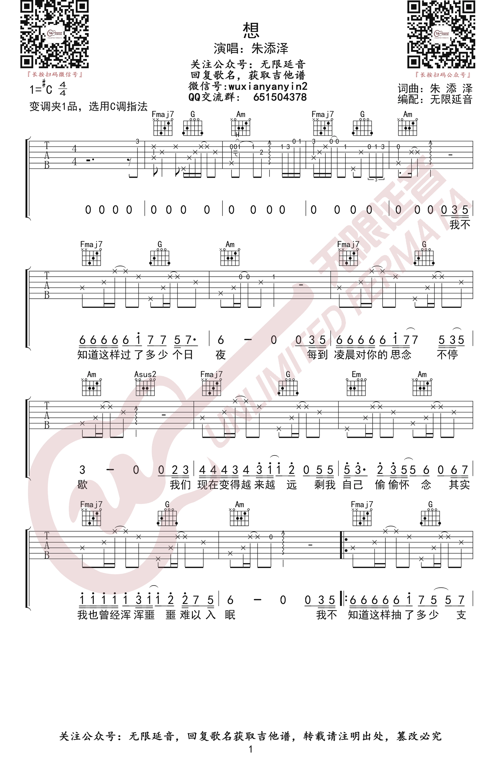 曲谱介绍: 朱添泽词曲原创的一首歌曲,想吉他谱,原调升C,选用C调和弦指法,变调夹夹第一品。《想》吉他弹唱谱,三张图片六线谱。遗憾终究是遗憾,爱一个人希望她幸福,自己也无憾了,请陌生人好好爱她、珍惜她别辜负她,也许只有遗憾,才能让人念念不忘吧!