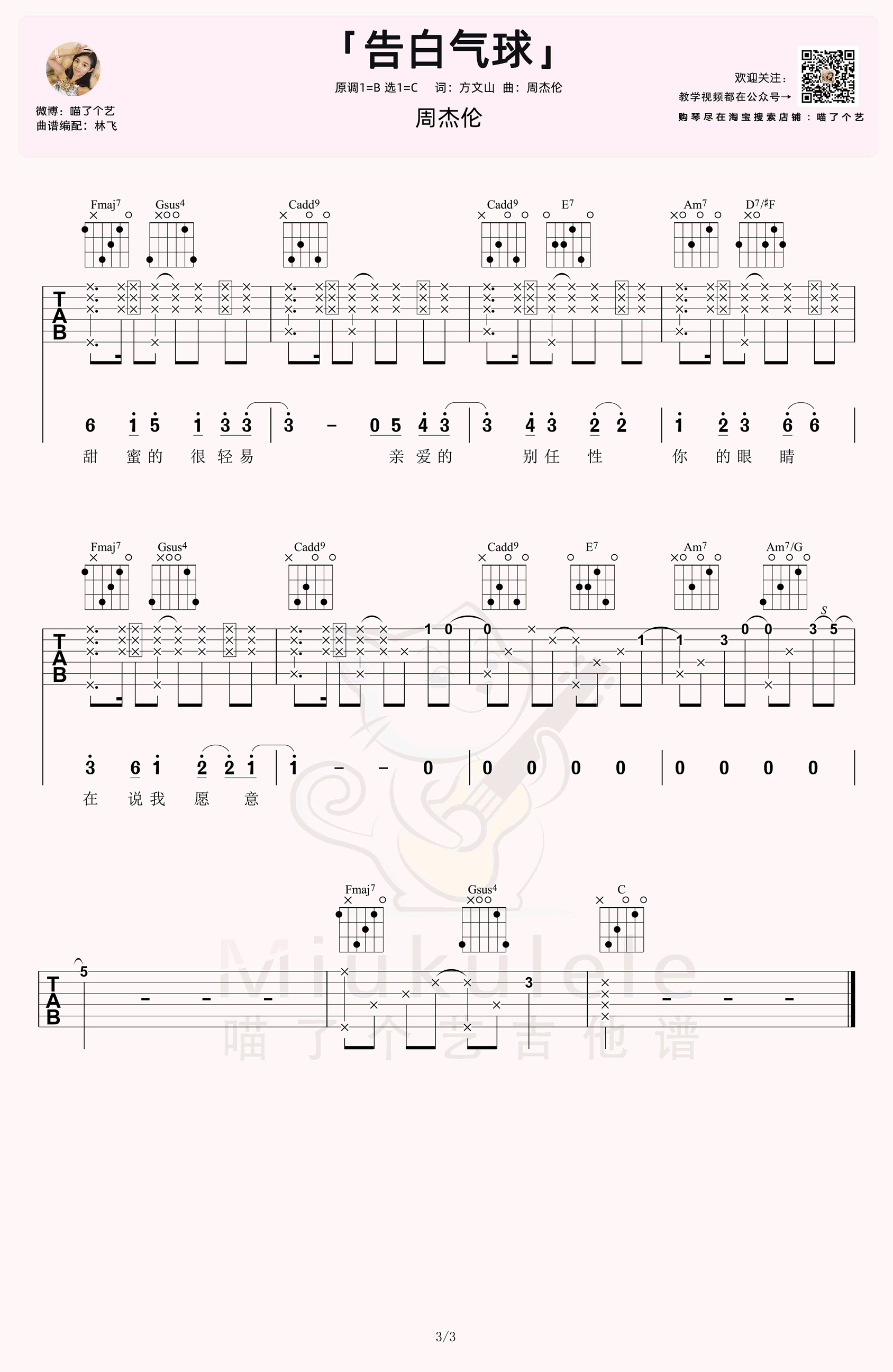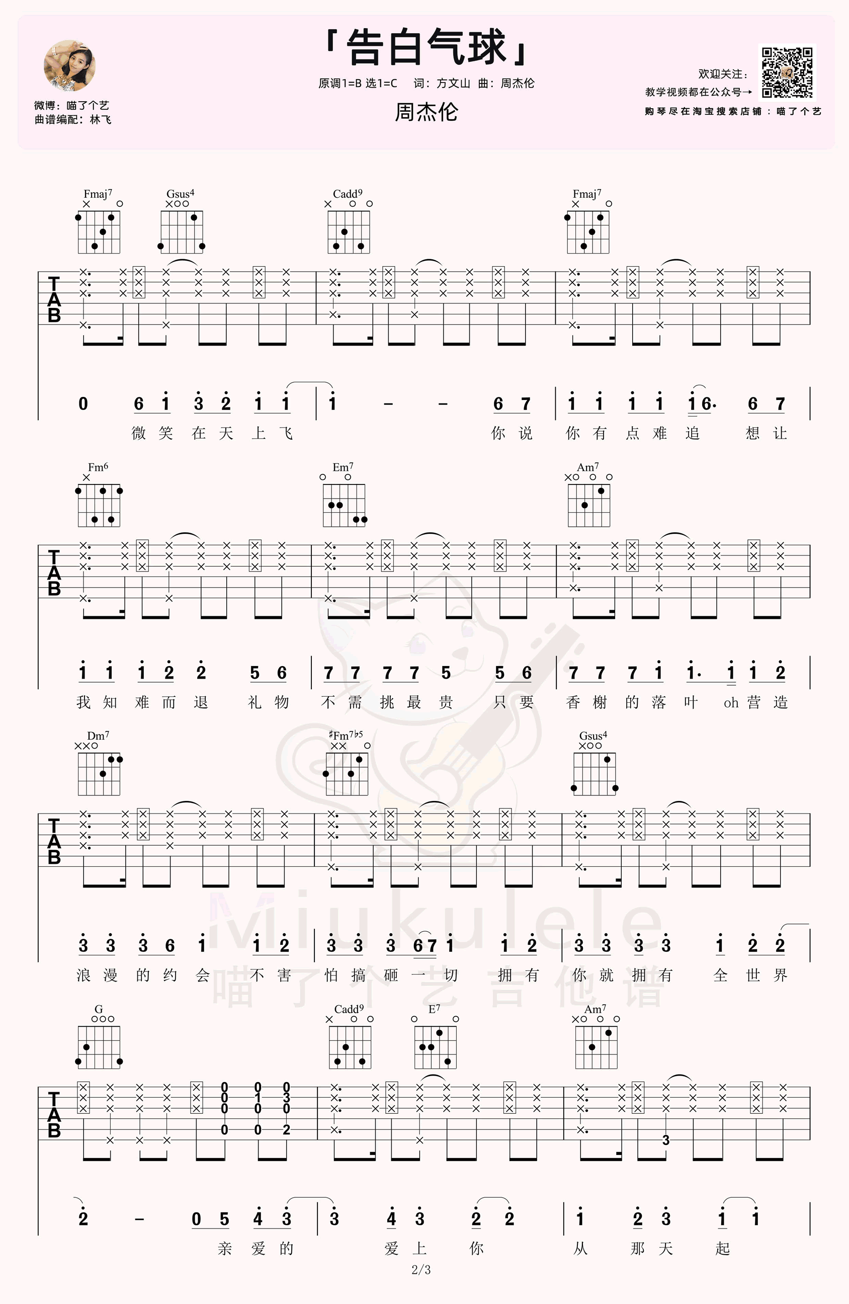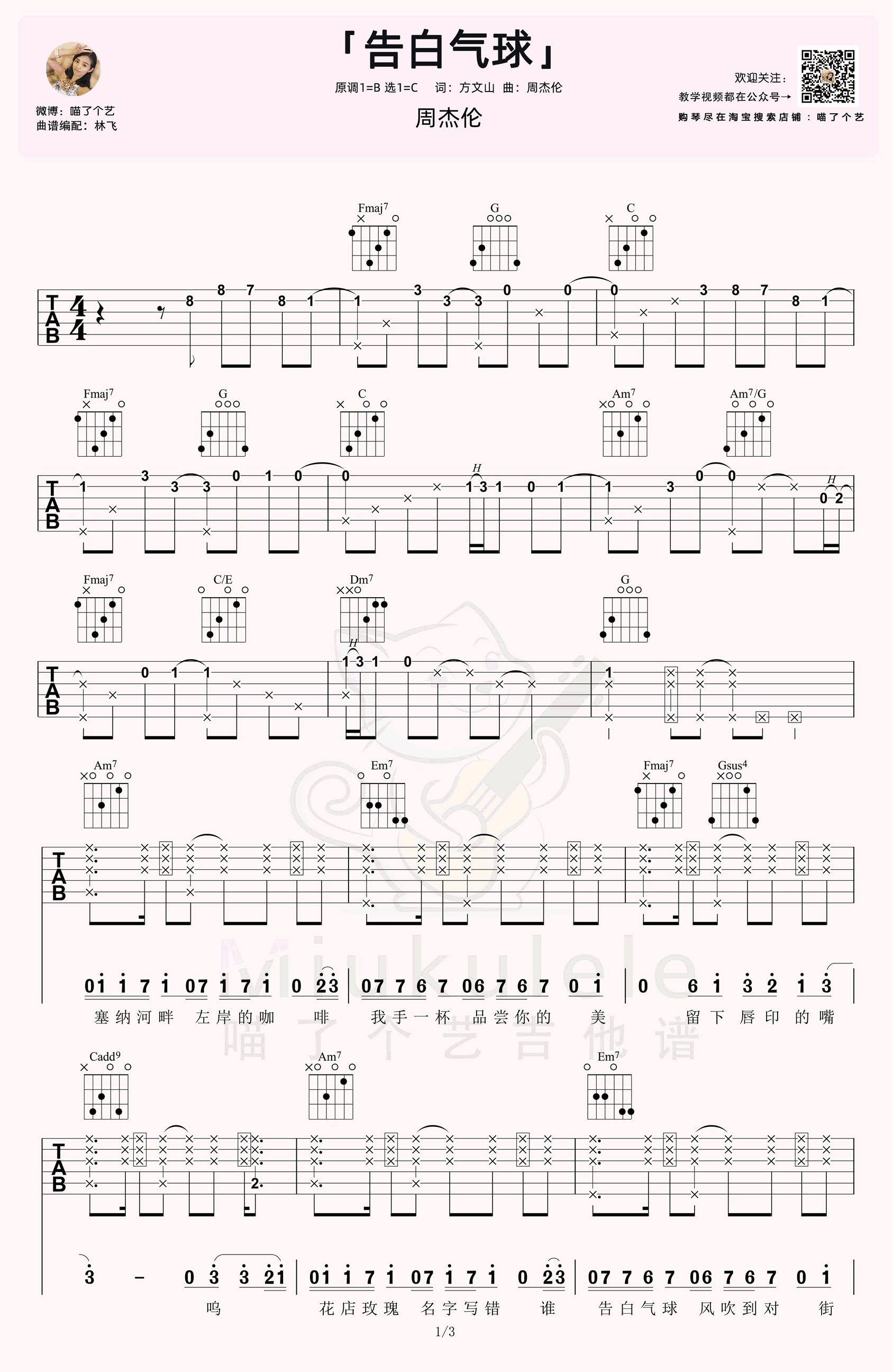 曲谱介绍: 周杰伦的一首甜蜜情歌,告白气球吉他谱,原调B选调C,三张图片六线谱。[亲爱的,爱上你,恋爱日记飘香水的回忆],就算不恋爱听了也能感到愉悦的歌~表白甜蜜曲,弹起来连空气都是粉红色,林老师又酷又甜的《告白气球》吉他弹唱教学,不学不行!