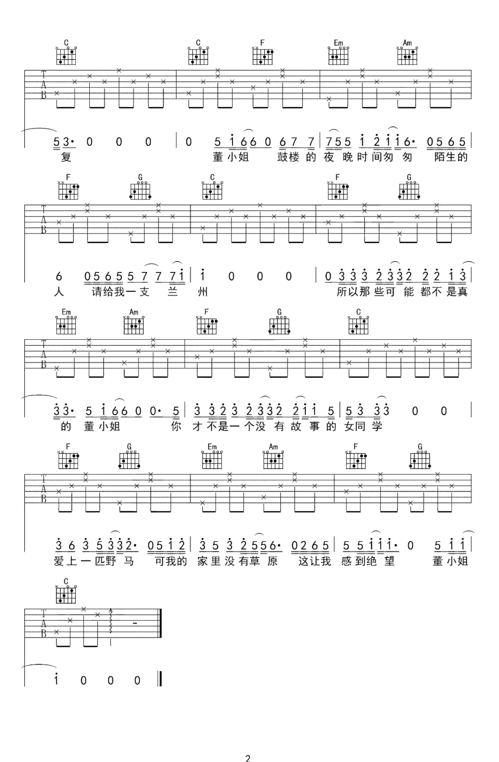 曲谱介绍: 宋冬野《董小姐》吉他弹唱谱,采用C调指法编配,共有2张高清图谱,免翻页排版设计。