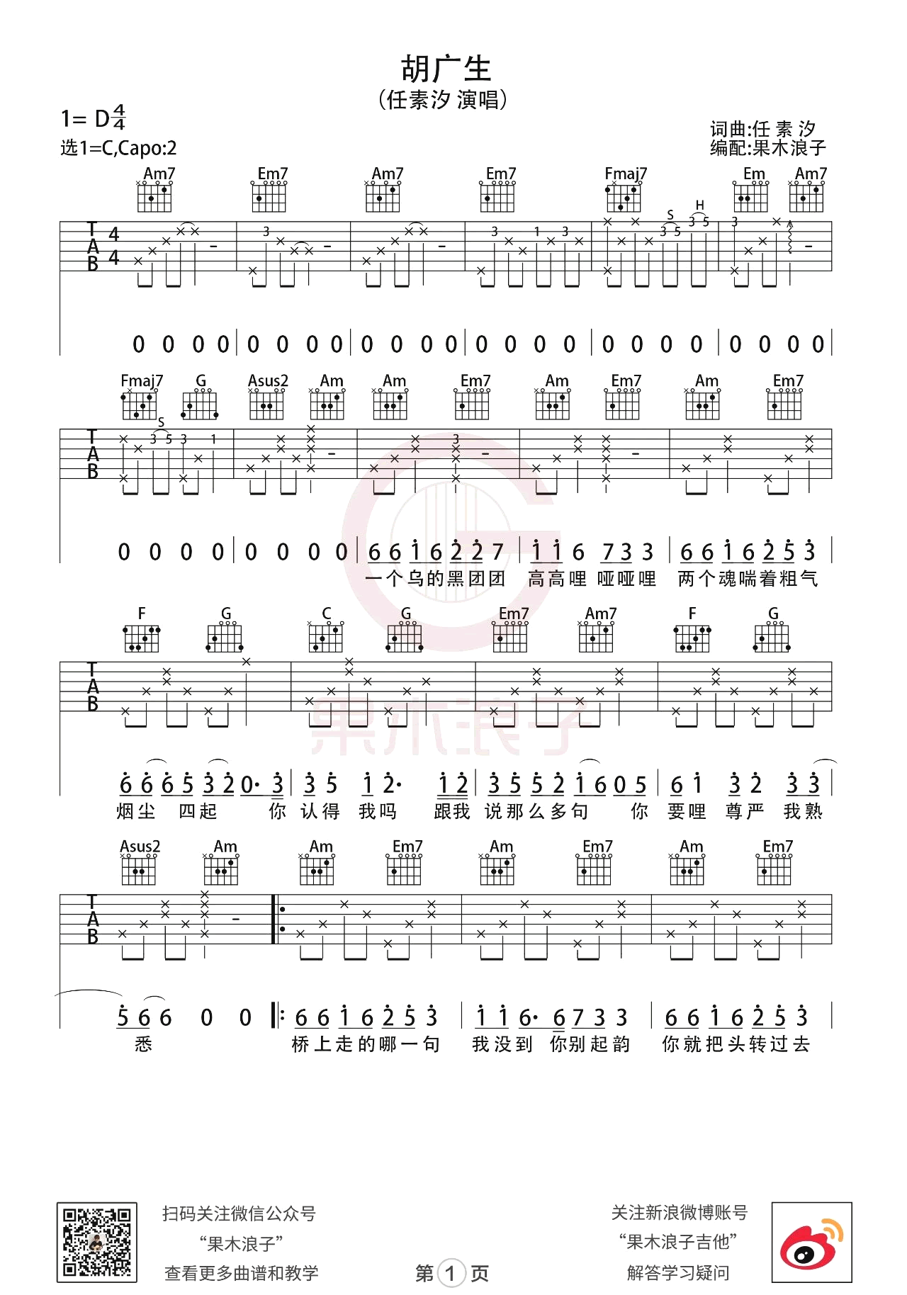 胡广生吉他谱 - 任素汐 - C调吉他弹唱谱