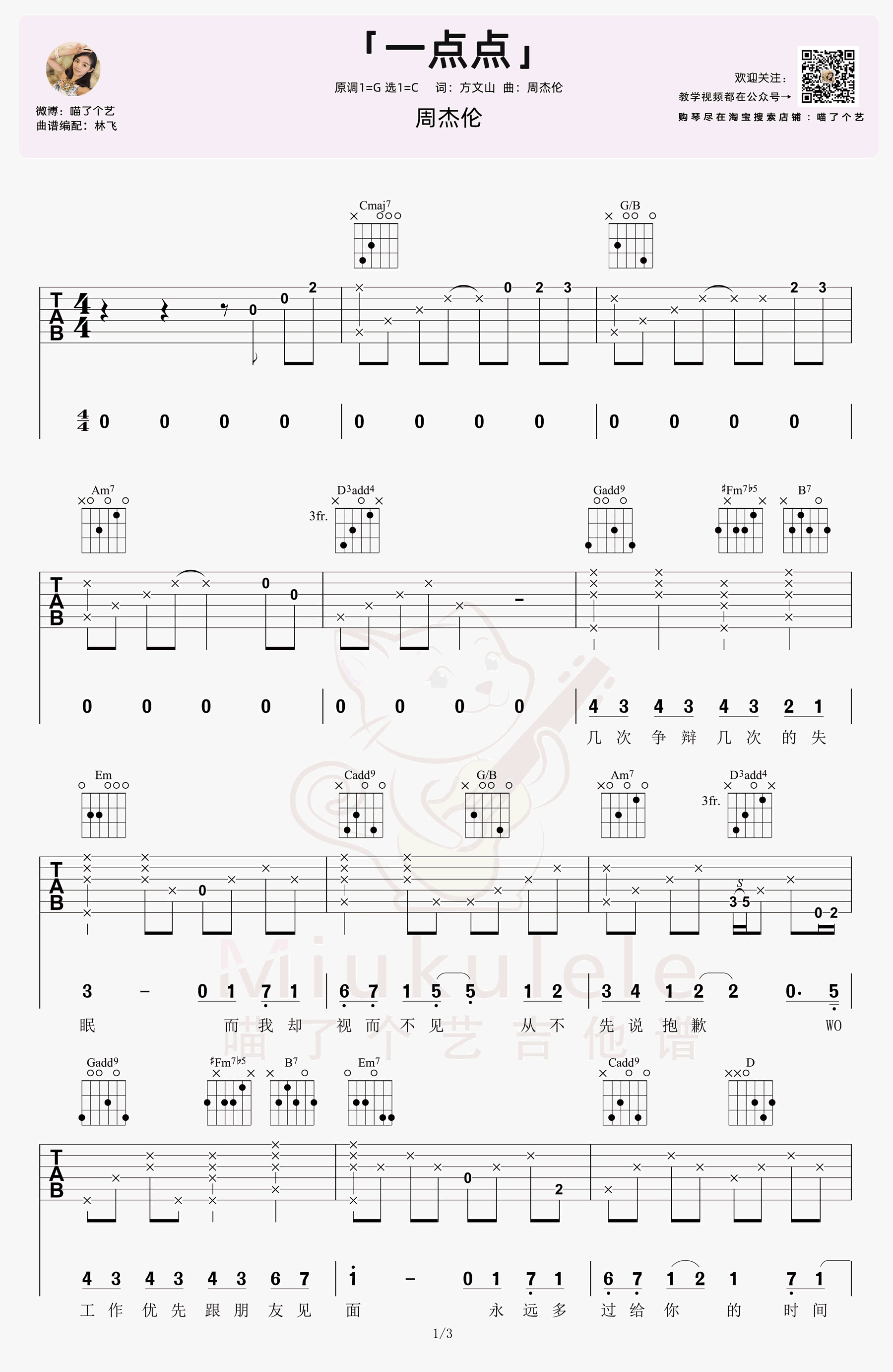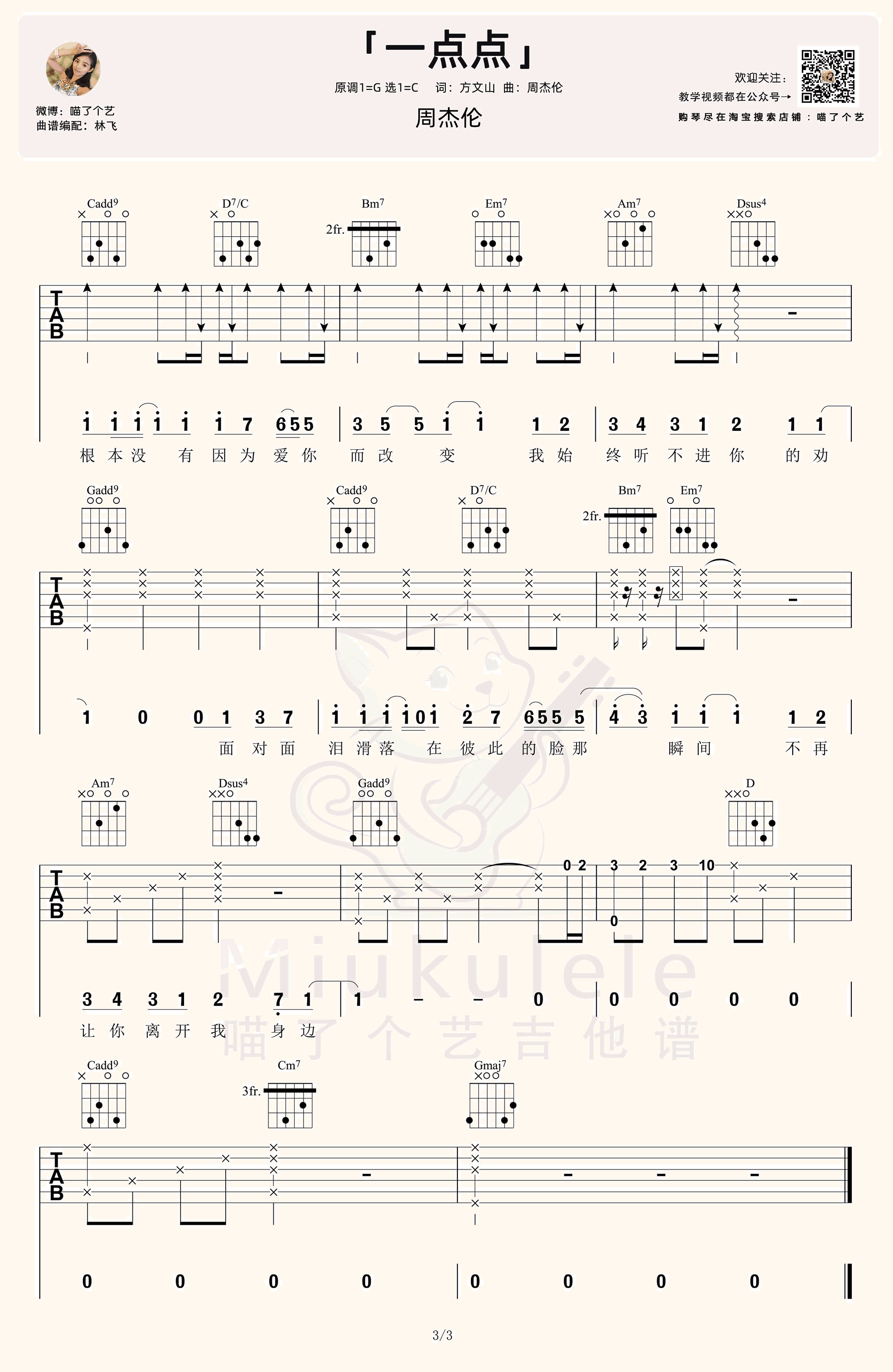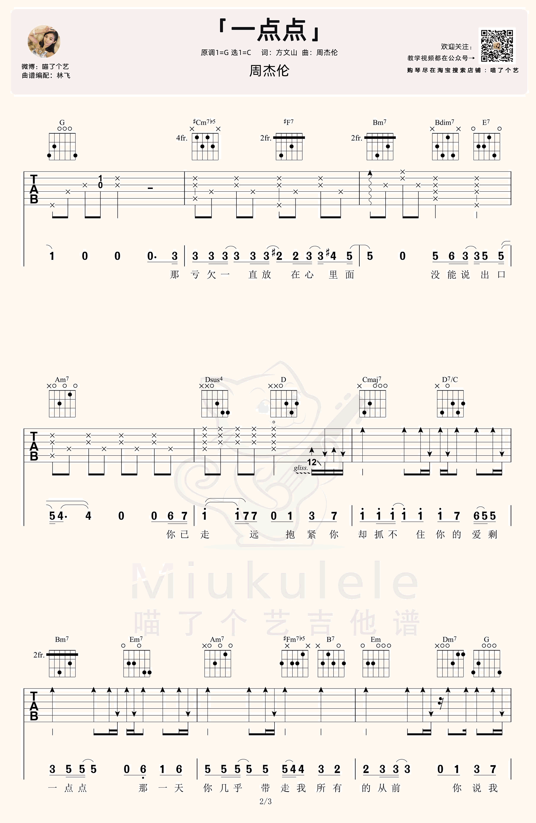 曲谱介绍: 周杰伦旋律动听的一首伤感情歌,一点点吉他谱,原调G选调C,变调夹夹二品,三张图片六线谱。