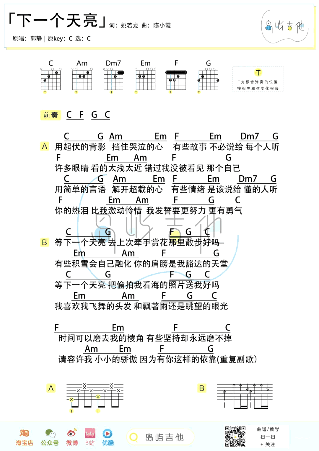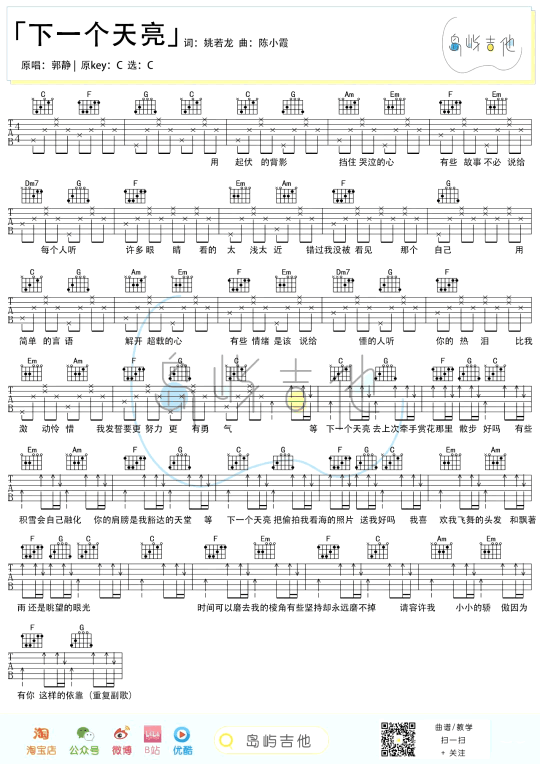 曲谱介绍: 郭静《下一个天亮》吉他弹唱谱,采用C调指法编配,共有2张高清图谱,免翻页排版设计。