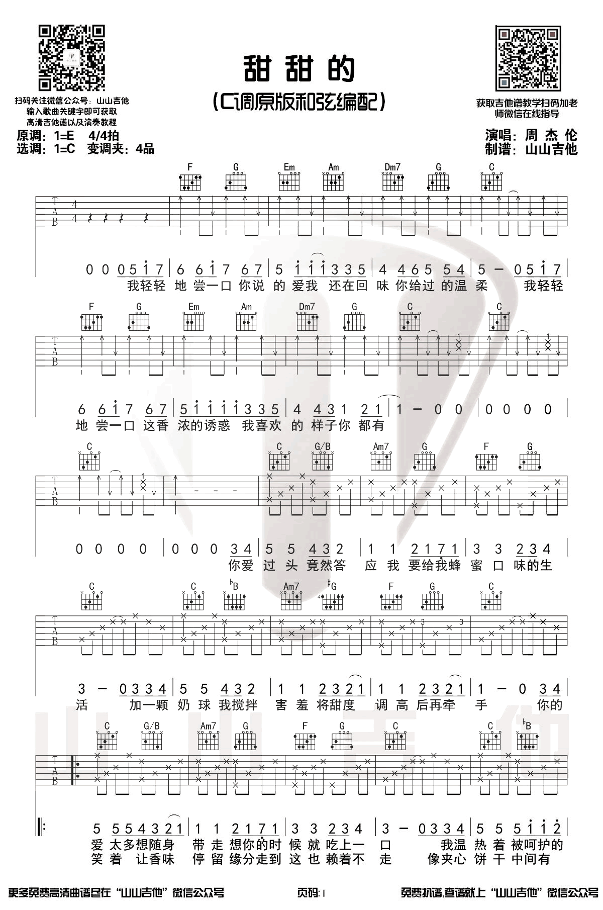 曲谱介绍: 周杰伦的一首歌曲,甜甜的吉他谱,原调E,C调和弦指法穿插几个调外和弦,变调夹:3品。周董原调是4品,大家可根据自己的音域适当调节变调夹的位置,三张图片六线谱。随谱附上《甜甜的》吉他弹唱视频,方便同学们跟随老师的演示练习。