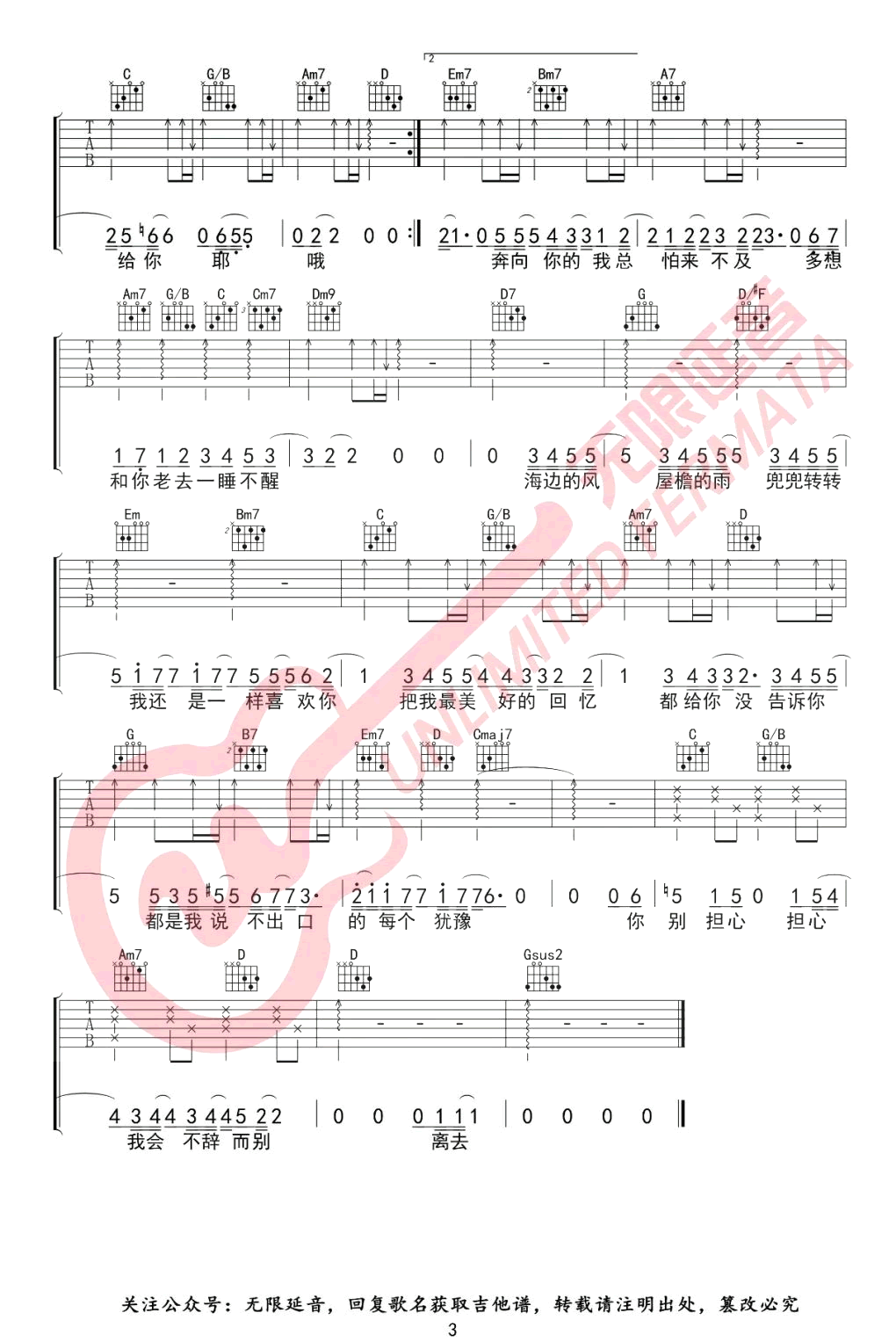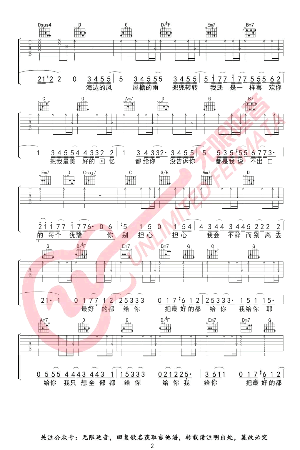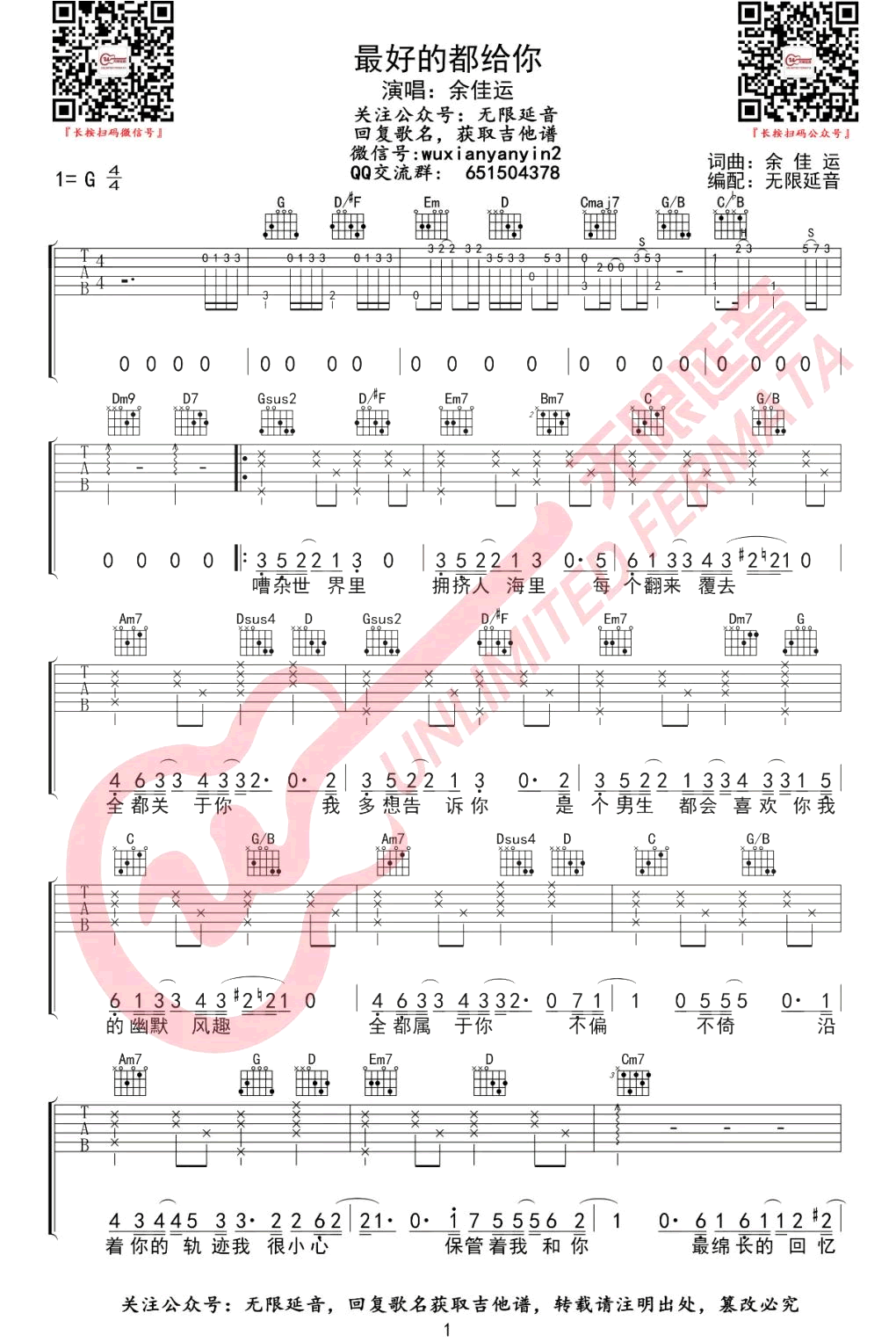 曲谱介绍: 余佳运《最好的都给你》吉他弹唱谱,采用G调指法编配,共有3张高清图谱。