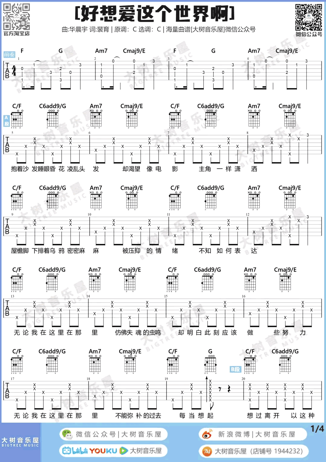 曲谱介绍: 华晨宇《好想爱这个世界啊》吉他弹唱谱,采用C调指法编配,共有4张高清图谱。