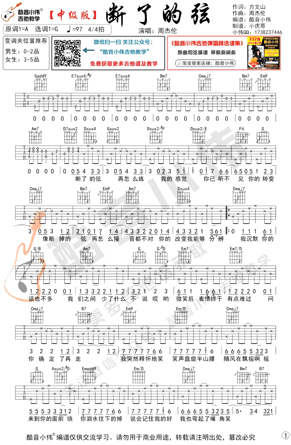曲谱介绍: 周杰伦的一首经典老歌,断了的弦吉他谱,原调A选调G,变调夹位置推荐,男生0-2品女生3-5品,两张图片六线谱。