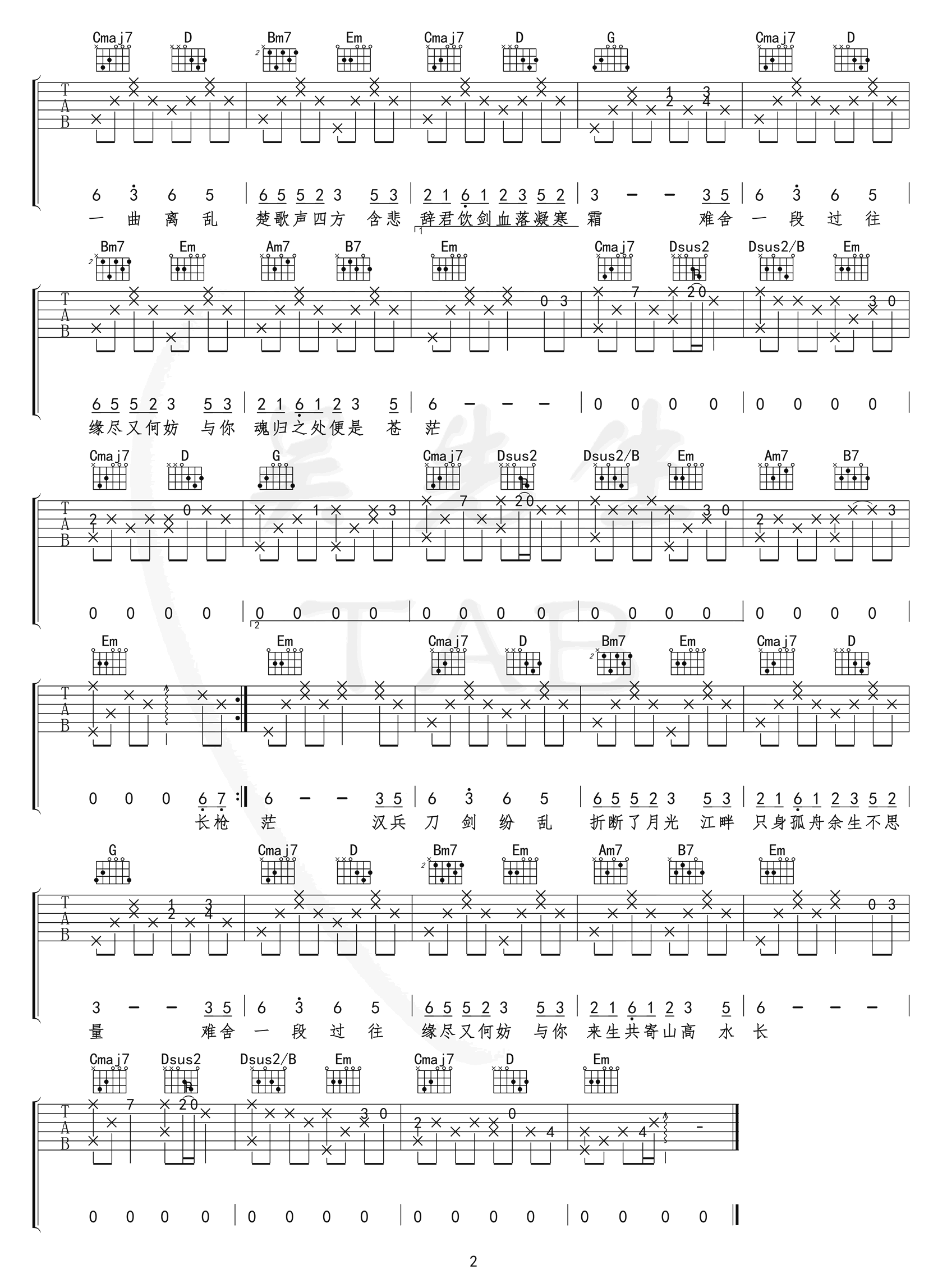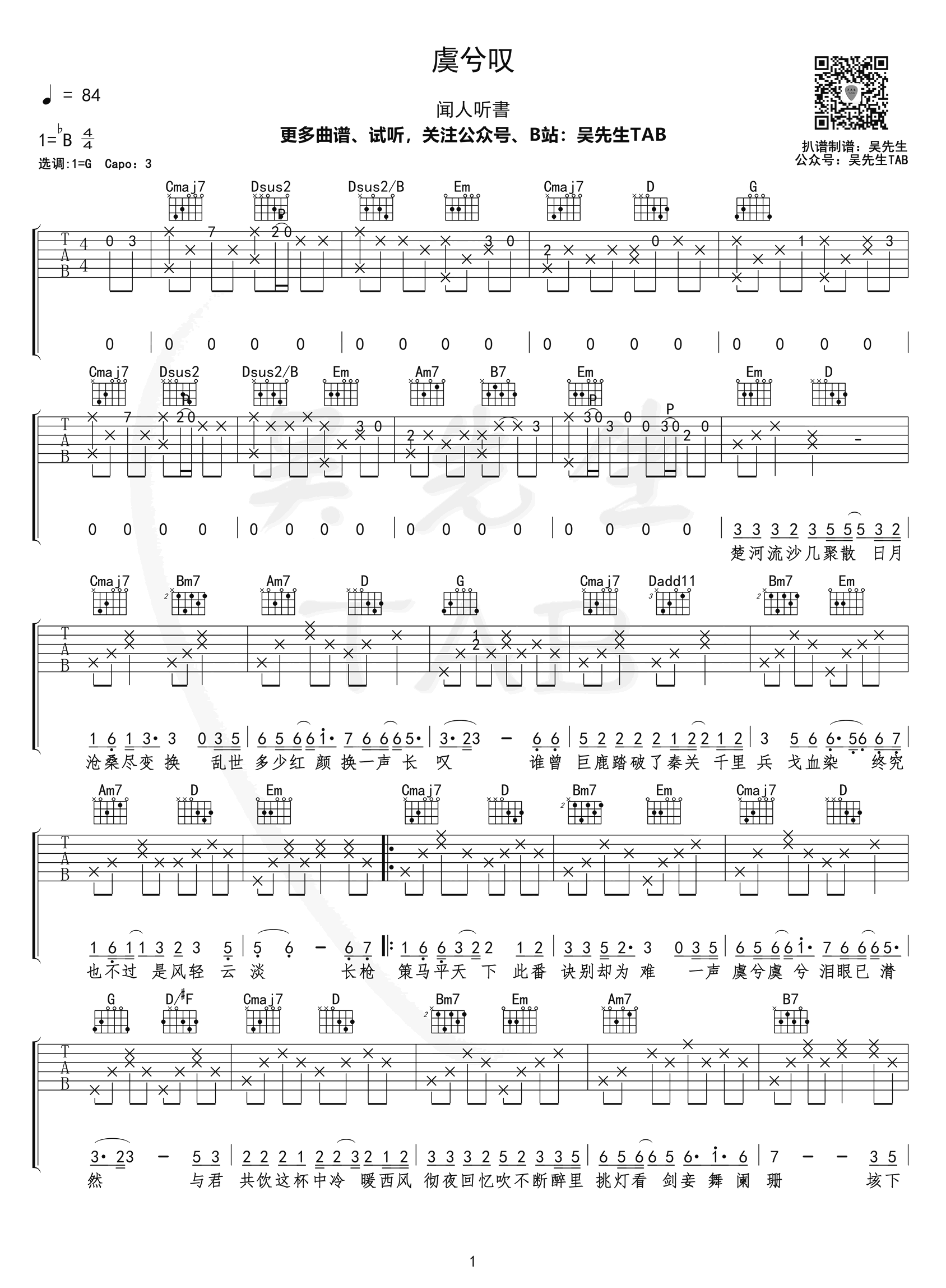 曲谱介绍: 闻人听书演唱的一首古风歌曲,虞兮叹吉他谱,原调降B,选调G,CAPO夹二品。《虞兮叹》吉他弹唱谱,两张高清图片六线谱。情难舍,尘埃落,缘尽又何妨。阡陌红尘,梦回曲水边,与你再续前缘。一朝悲欢离合,一方翘楚枭雄,乱世烽火,香消魂断处,三生石旁再寄山高水长。