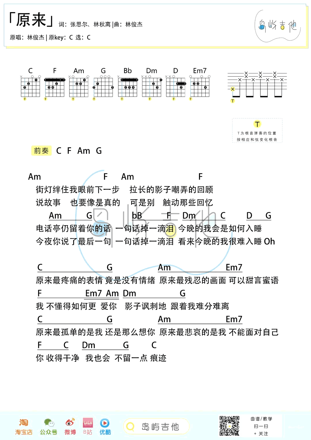 曲谱介绍: 林俊杰09年的一首老歌,原来吉他谱,选用C调和弦编配,和弦图片谱+六线谱,《原来》吉他弹唱谱,原来最疼痛的表情竟是没有情绪。一首曲风痴情伤感的抒情歌曲,典型的J式情歌,歌词旋律娓娓道来,说不尽那凄美无奈之情,这样的老歌,再听几遍也毫不厌倦~