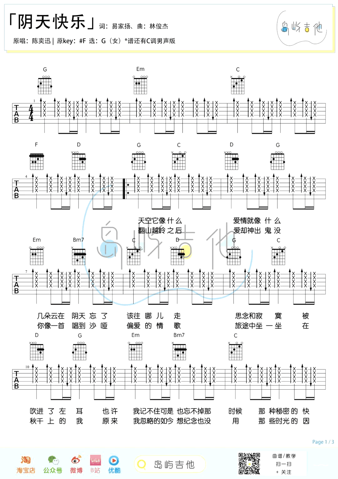 曲谱介绍: 陈奕迅的一首歌曲,阴天快乐吉他谱,原调升F,选用G调指法女生版编配,《阴天快乐》吉他弹唱谱,三张图片六线谱。前奏一响便勾起无数回忆,这是一首能唱到沙哑偏爱的情歌,音乐需要Eason陈奕迅,被他陪伴过的日子数不胜数,熟悉的旋律带着伤感,没关系,阴天也快乐!