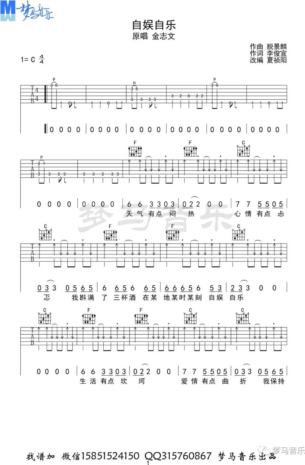 曲谱介绍: 金志文《自娱自乐》吉他弹唱谱,采用C调指法编配,共有4张高清图谱。
