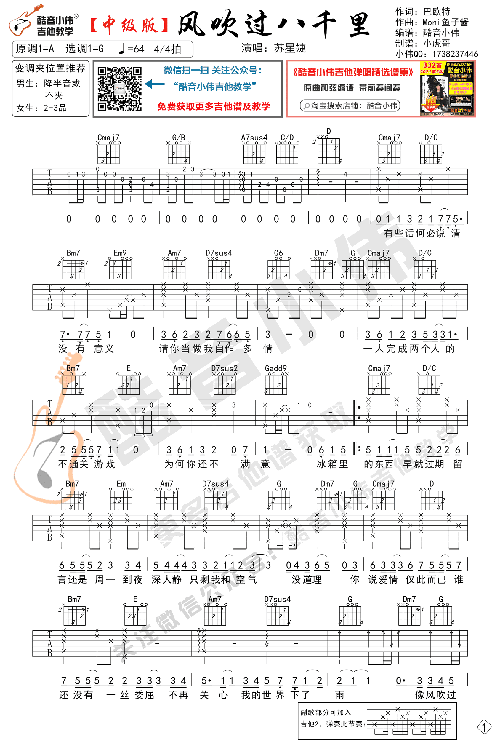 曲谱介绍: 苏星婕的一首抖音热门歌曲,风吹过八千里吉他谱,中级版编配,适合进阶学习。原调A选调G,变调夹建议,男生不夹或降半音调弦,女生夹二品。歌曲速度每分钟64,两张高清图片六线谱,《风吹过八千里》吉他弹唱演示及教学,同学们可以参照小伟老师的示范讲解分小节逐步学习。