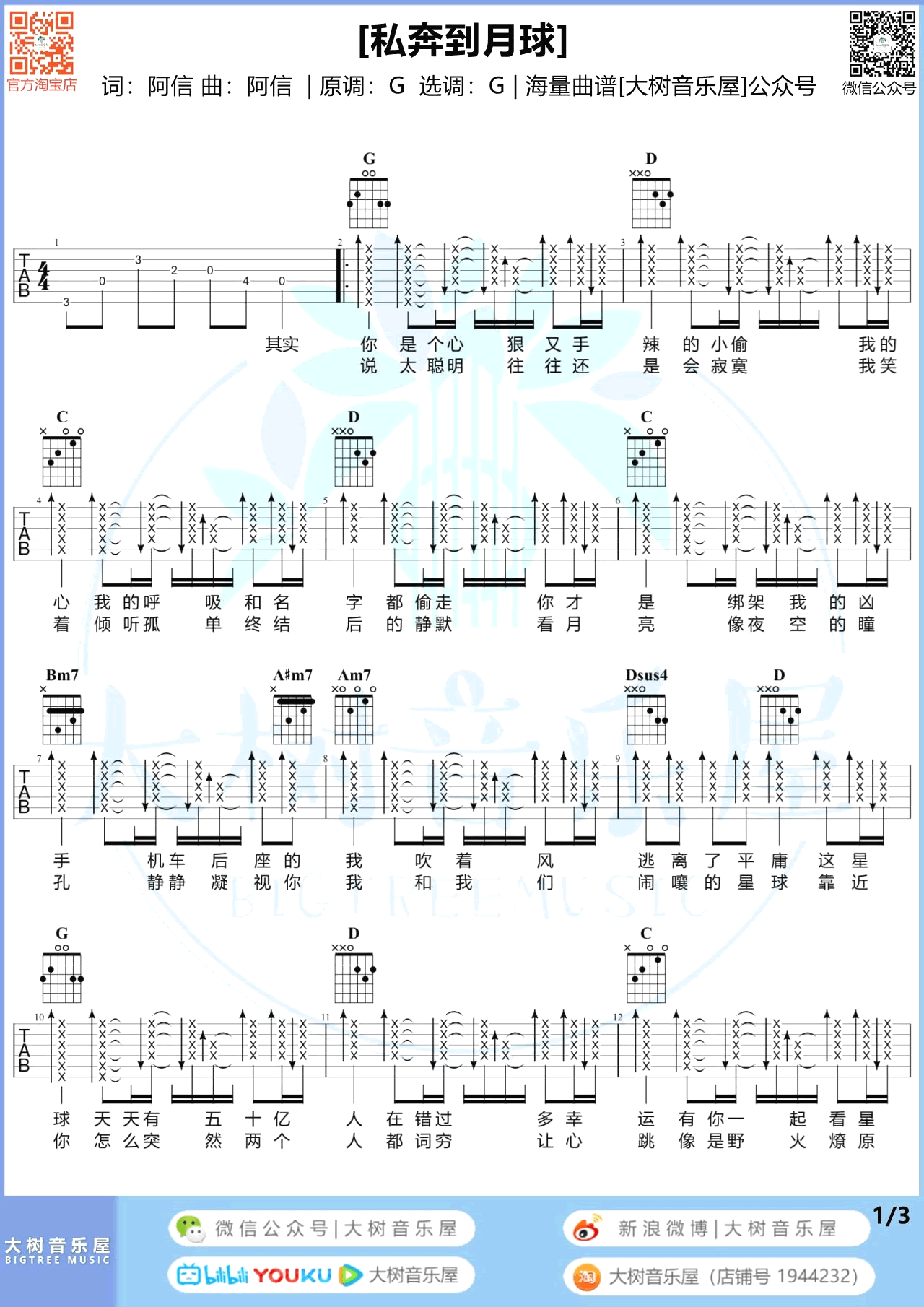 曲谱介绍: 五月天和陈绮贞的一首男女合唱代表作品,私奔到月球吉他谱,选用原调G调编配,三张图片六线谱。《私奔到月球》吉他弹唱教学视频,同学们跟随橙子老师的讲解学习起来。温馨的浪漫情歌,朗朗上口的旋律,描画出热恋爱人的幸福点滴,甜蜜的让人很想立刻去谈一场恋爱。