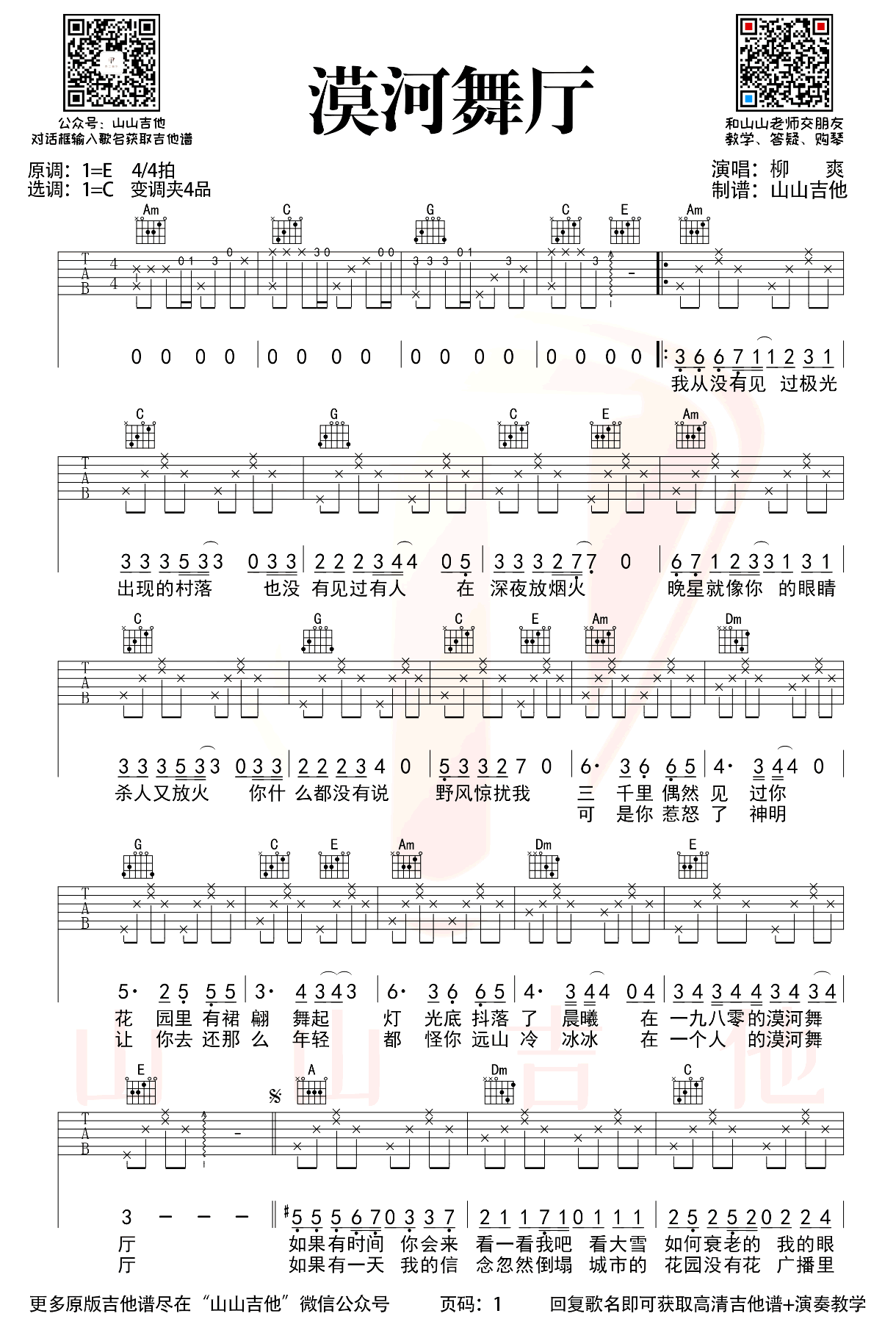 曲谱介绍: 柳爽创作演唱的一首超火的吉他弹唱歌曲,漠河舞厅吉他谱,原调E选调C,男生变调夹夹第四品,女生0-2品,两张图片六线谱。随谱附上《漠河舞厅》吉他弹唱教学视频,如果有时间,你会来看一看我吗?这首歌曲纪念那段来自于半个世纪前的爱情故事,献给所有因不幸而逝去的美好的生命,也送给那些,赋予离去生命继续存在意义的,拥有着爱的人们……
