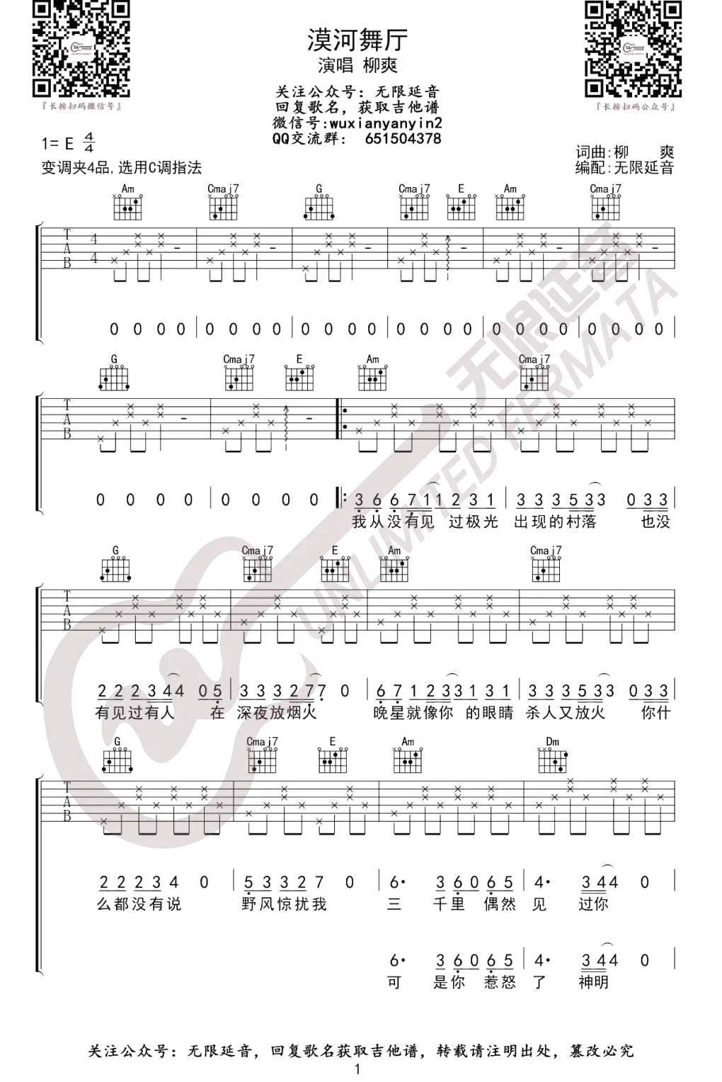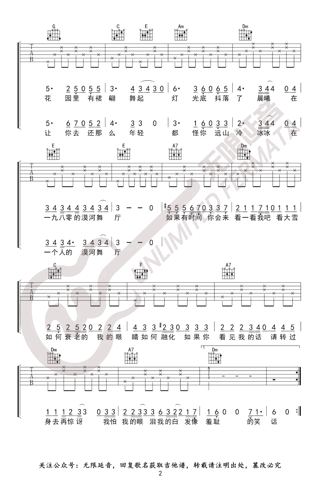曲谱介绍: 柳爽《漠河舞厅》吉他弹唱谱,采用C调指法编配,共有3张高清图谱。