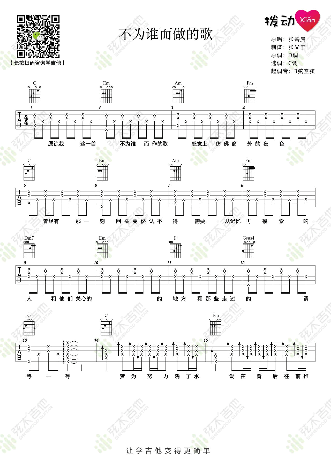 曲谱介绍: 林俊杰演唱的一首经典情歌,不为谁而作的歌吉他谱,原调D选调C,起调音3弦空弦,两张图片六线谱。