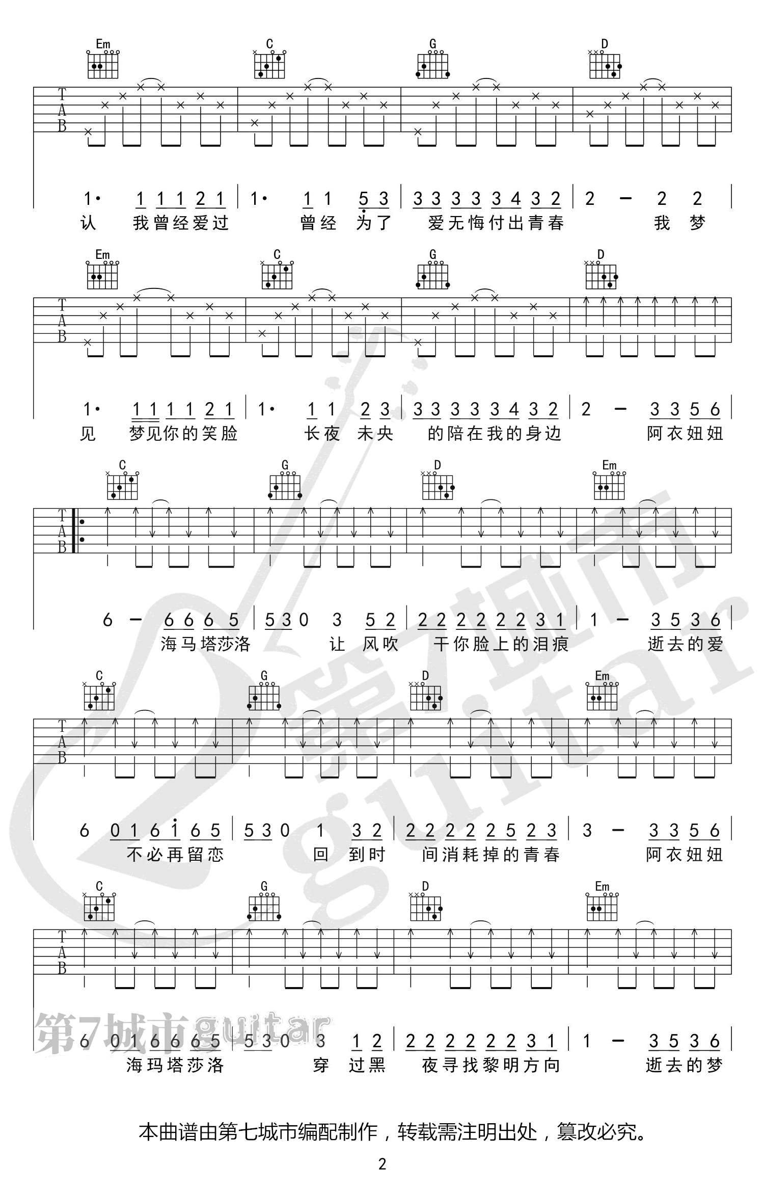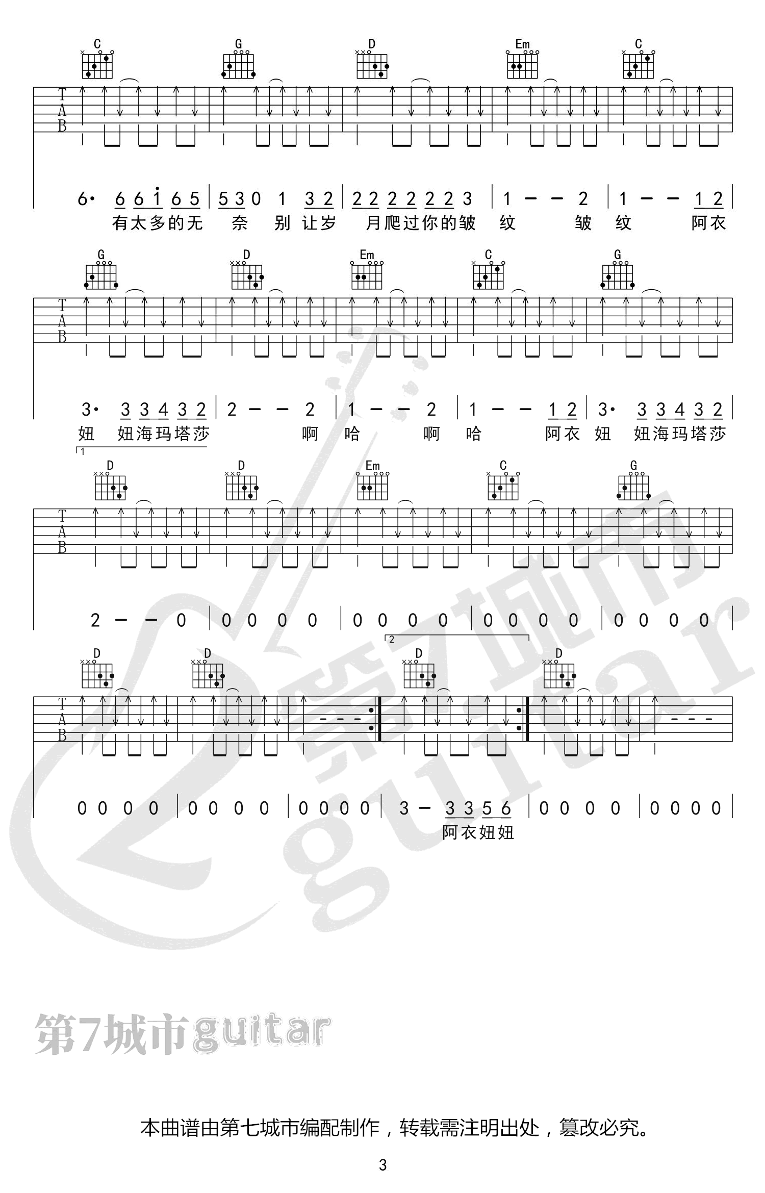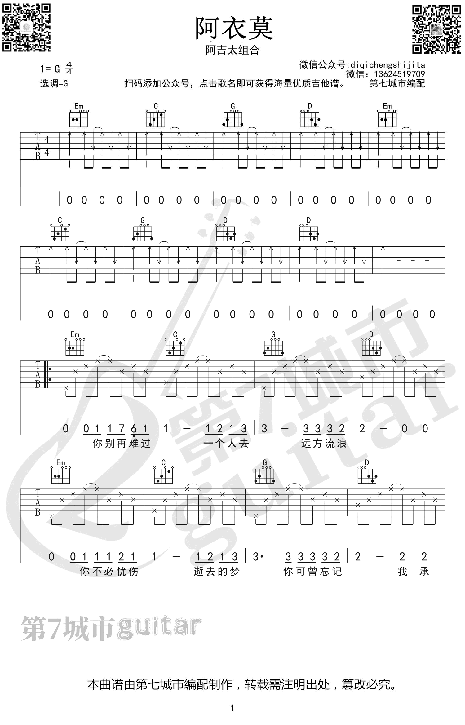 曲谱介绍: 阿吉太组合《阿衣莫》吉他弹唱谱,采用G调指法编配,共有3张高清图谱。