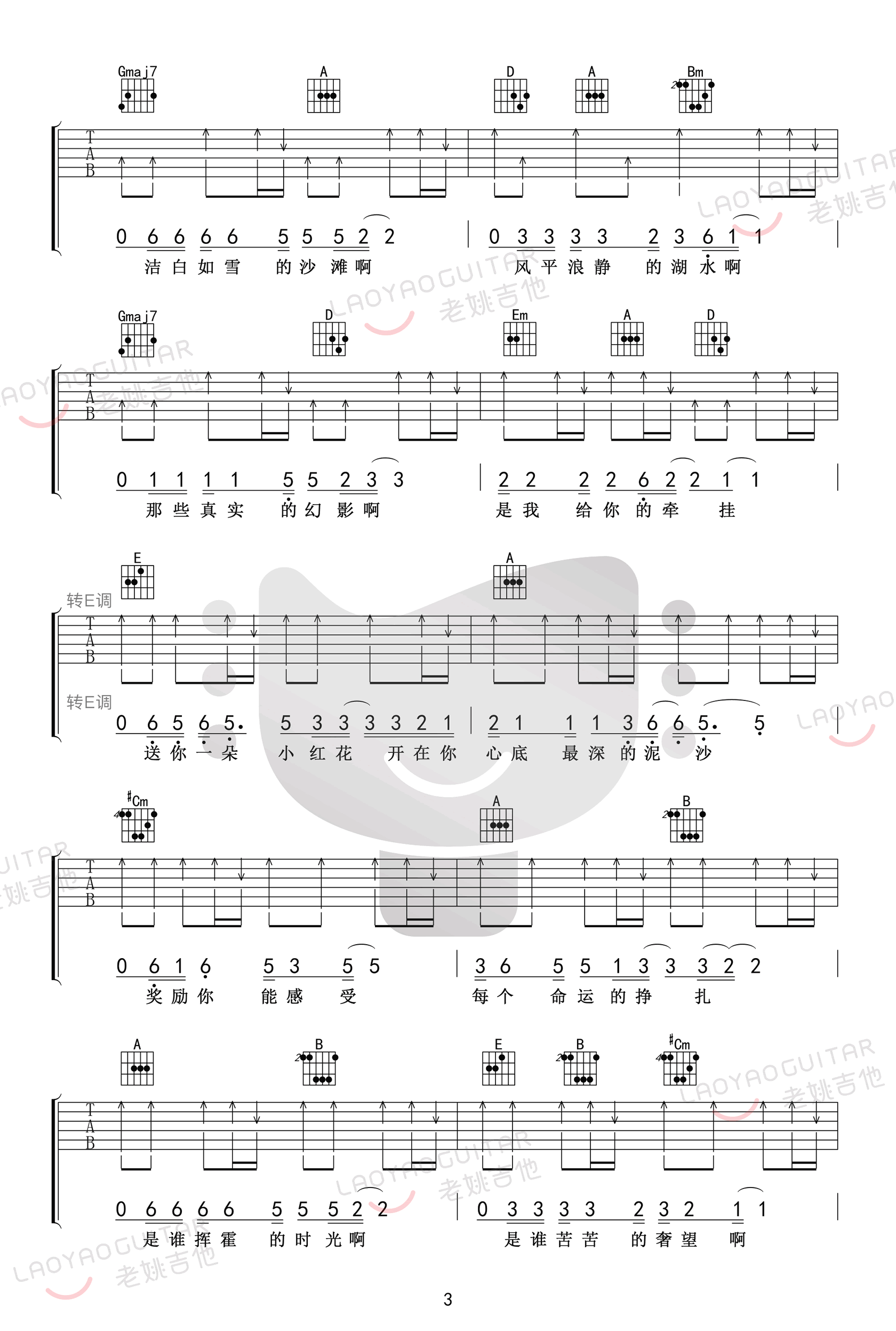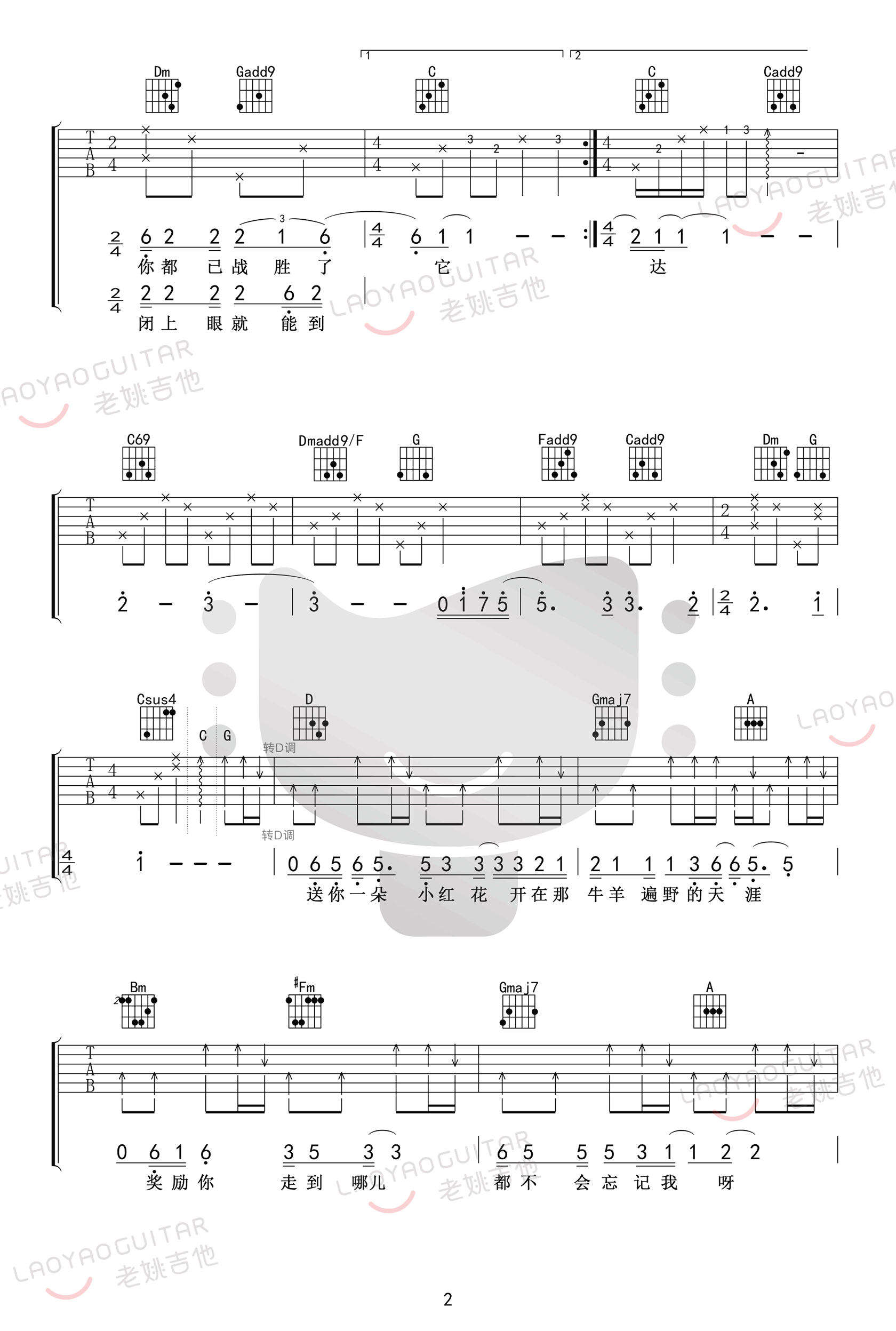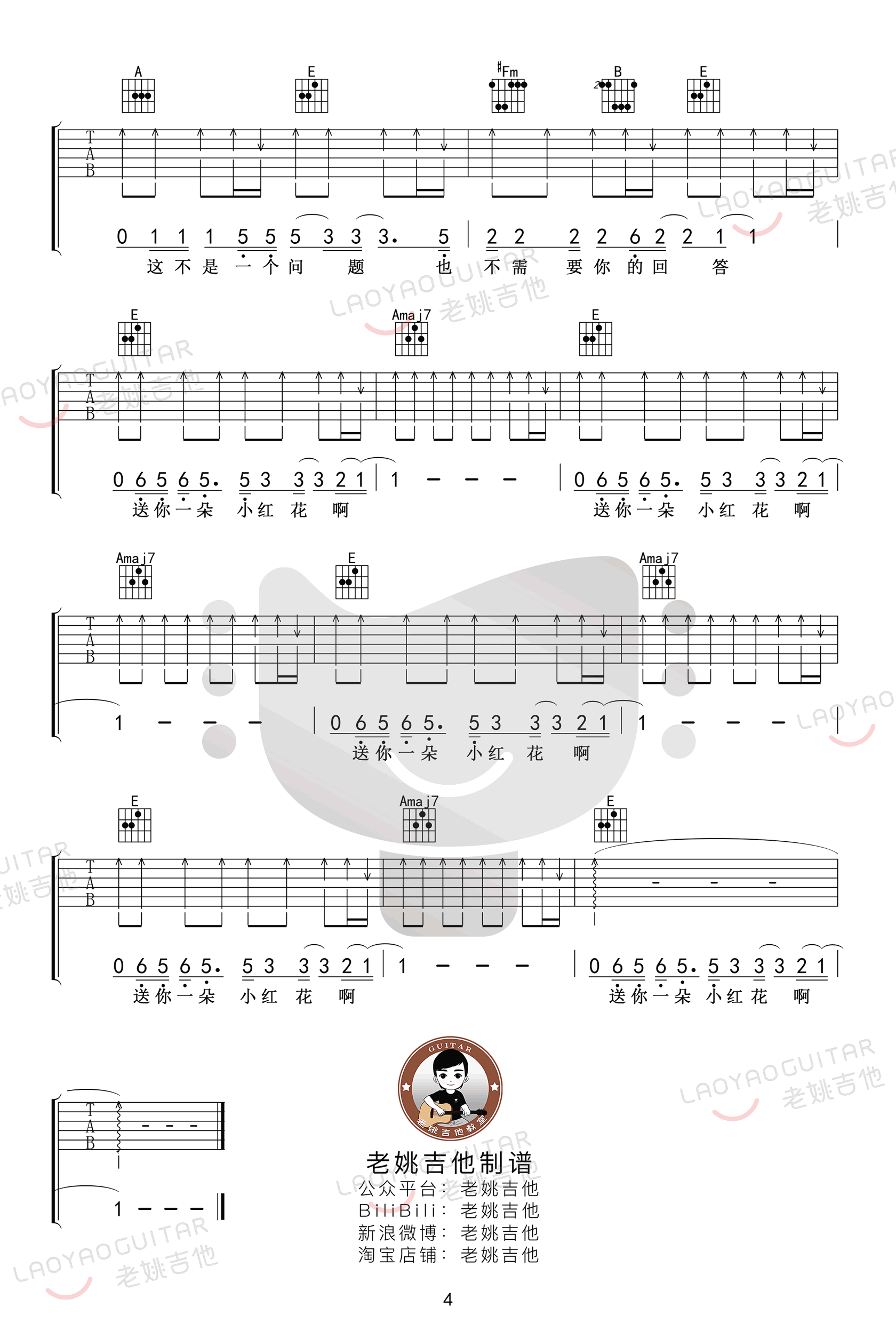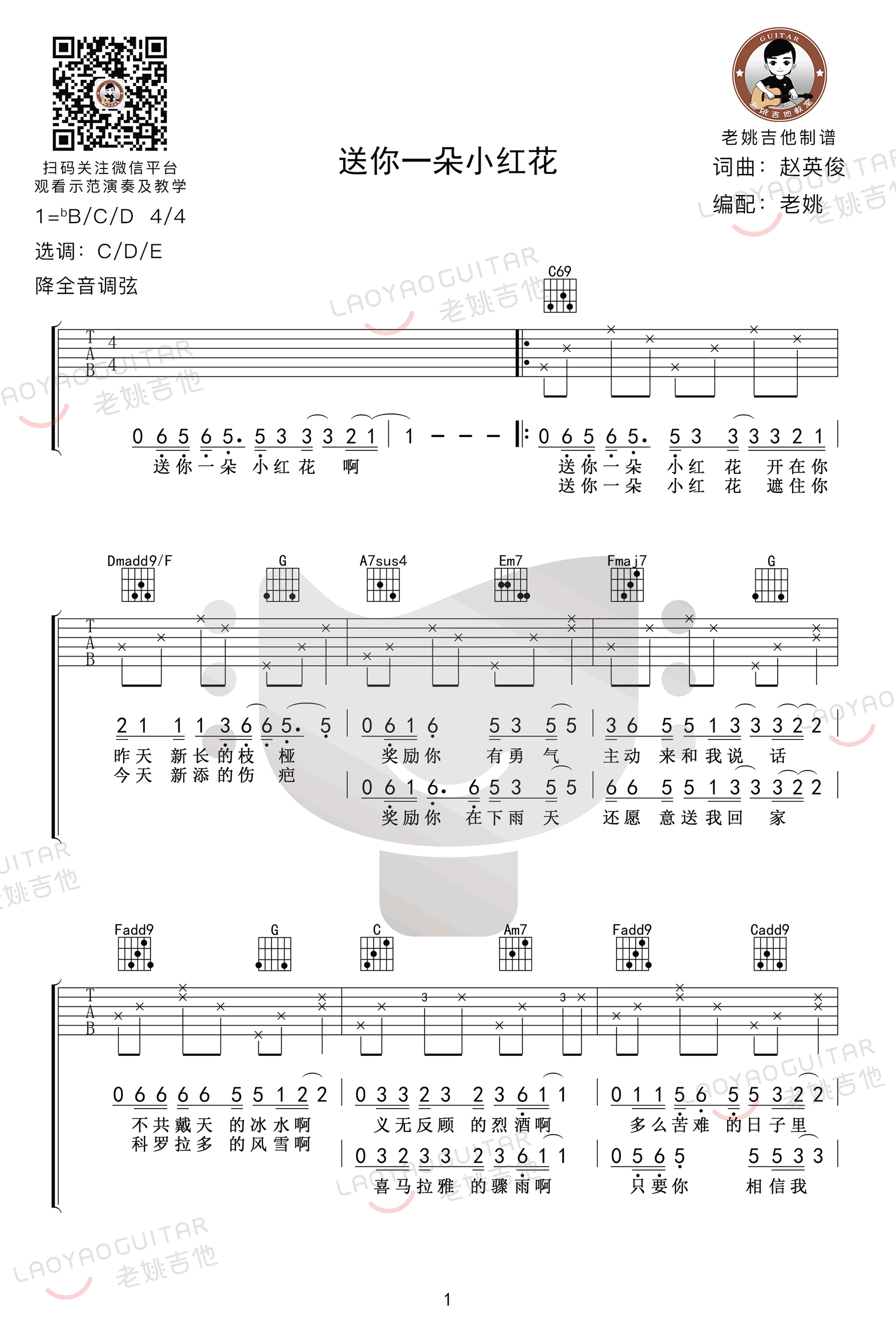 曲谱介绍: 赵英俊词曲创作的一首感人歌曲,也是同名电影主题歌。送你一朵小红花吉他谱,选用C/D/E调,降全音调弦,六线谱完整版共四张高清图片。