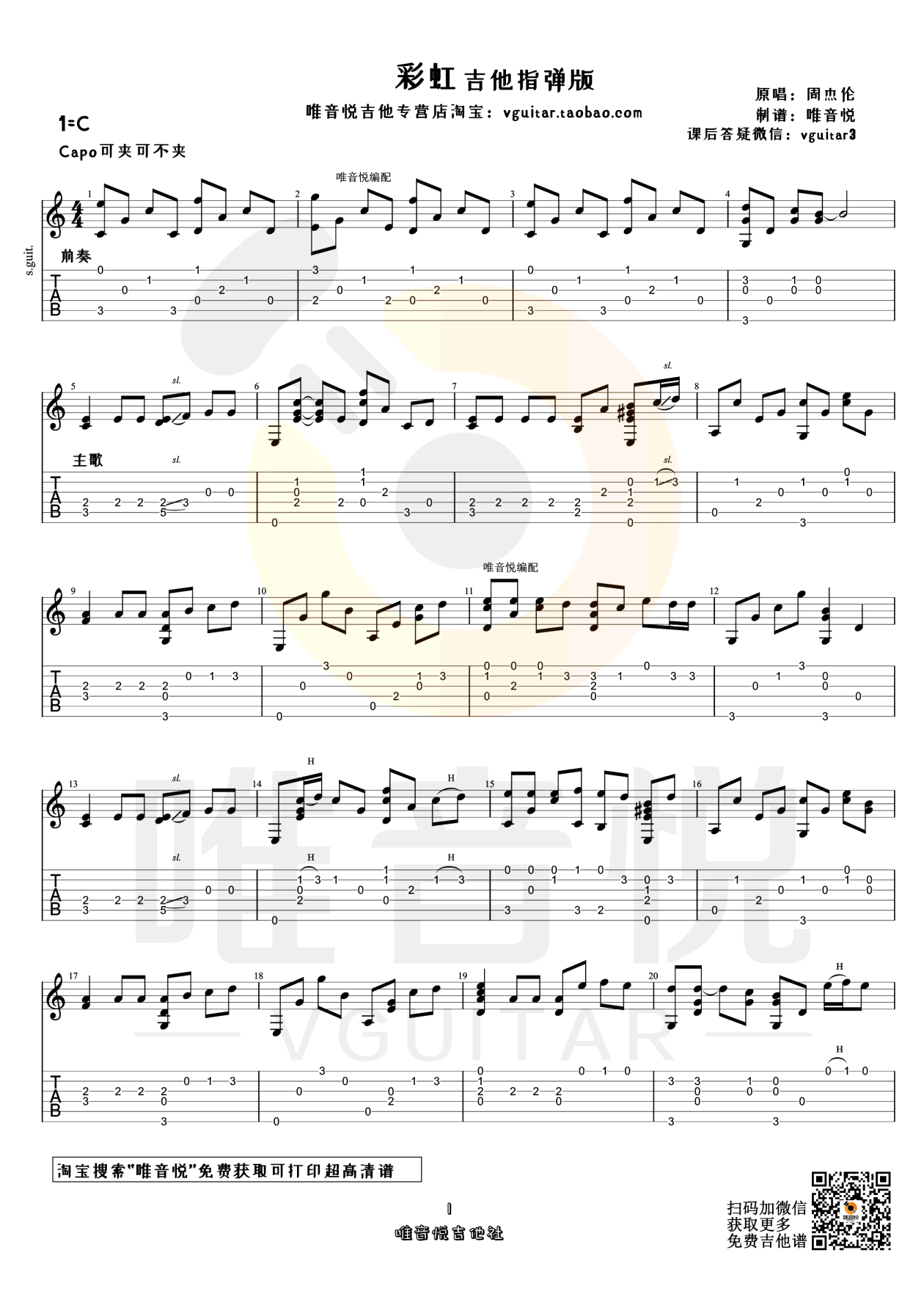 曲谱介绍: 周杰伦的一首经典作品改编,彩虹吉他指弹谱,C调编配,可不用变调夹,两张图片六线谱。