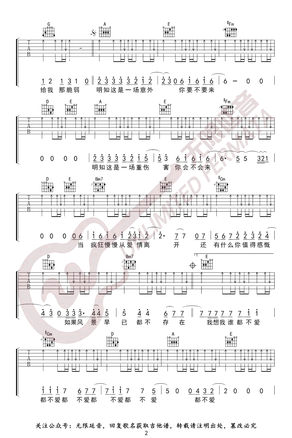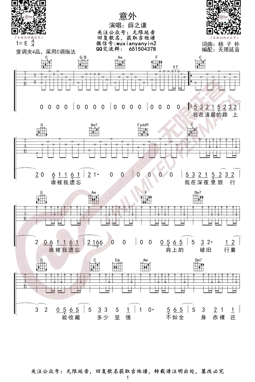 曲谱介绍: 薛之谦《意外》吉他弹唱谱,采用C调指法编配,共有3张高清图谱。