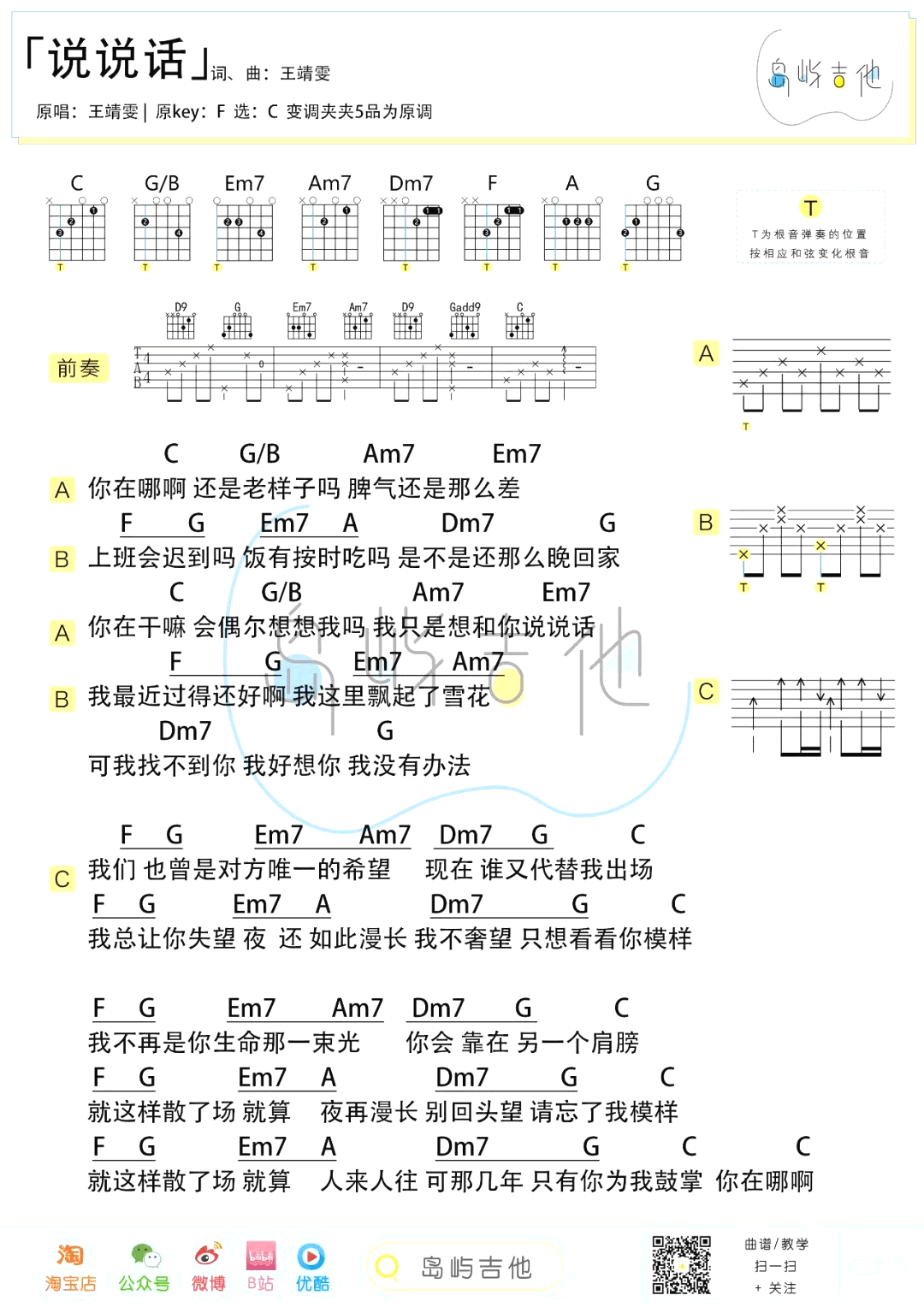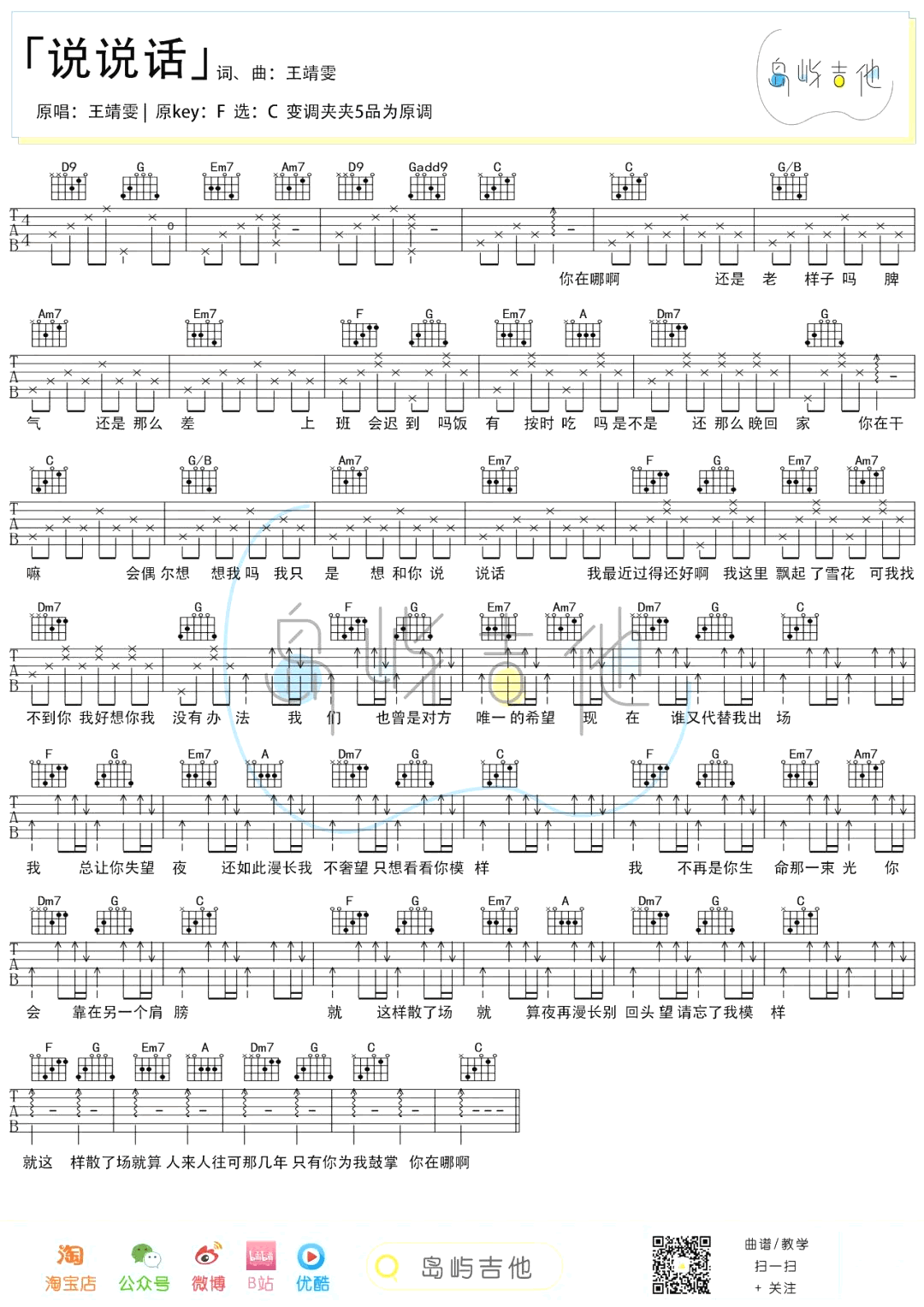 曲谱介绍: 王靖雯《说说话》吉他弹唱谱,采用C调指法编配,共有2张高清图谱,免翻页排版设计。
